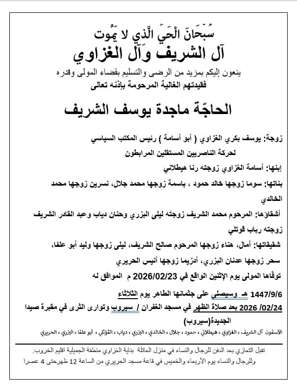 وفاة الحاجة ماجدة يوسف الشريف، الدفن ظهر يوم الثلاثاء في 24 شباط 2026 الإثنين 23/شباط/2026 - 10:10 م 2/23/2026 10:10:28 PM شارك