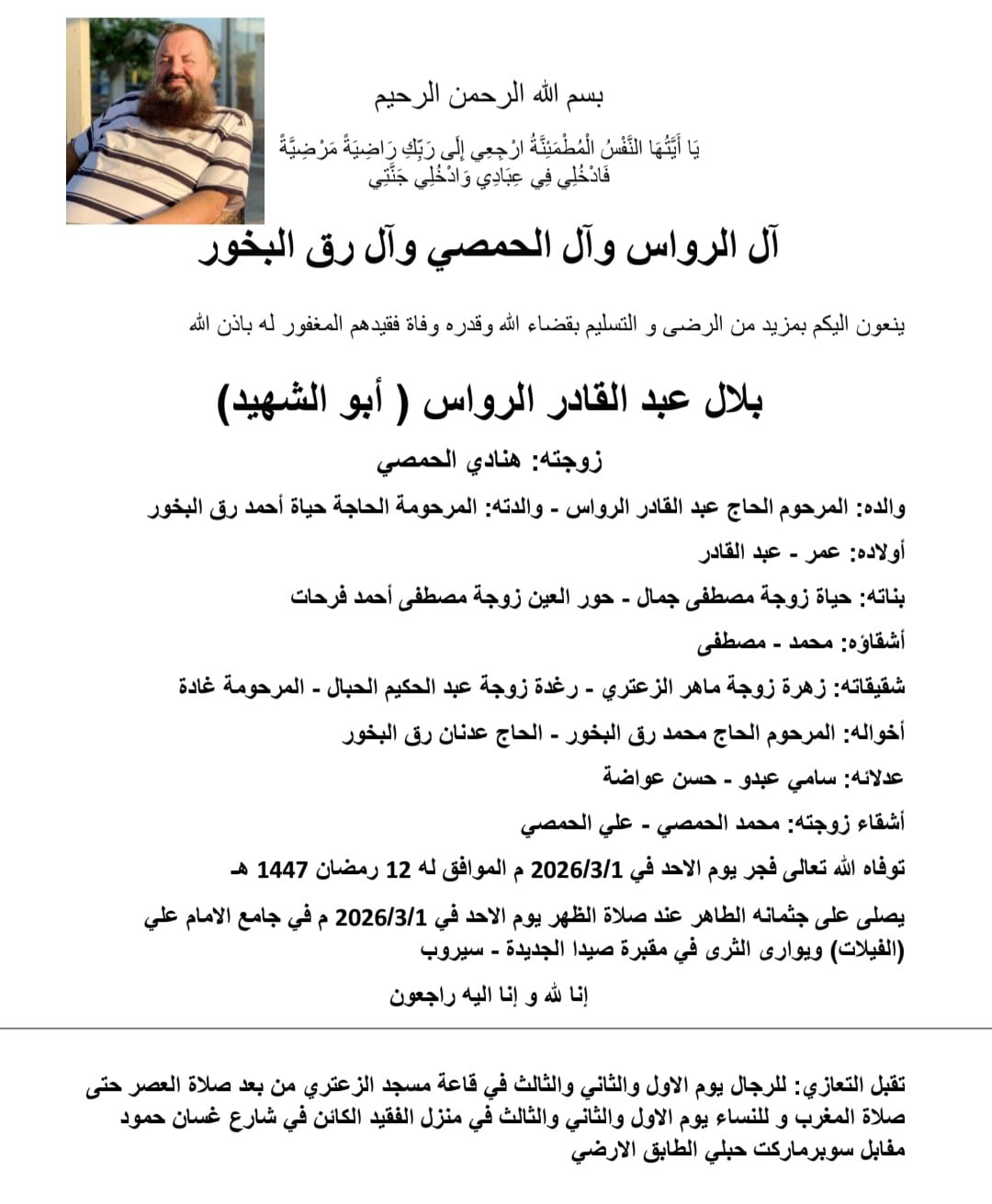 وفاة بلال عبدالقادر الرواس (ابو الشهيد)، الدفن ظهر يوم الاحد في 1 آذار 2026 الأحد 01/آذار/2026 - 10:26 ص 3/1/2026 10:26:49 AM شارك