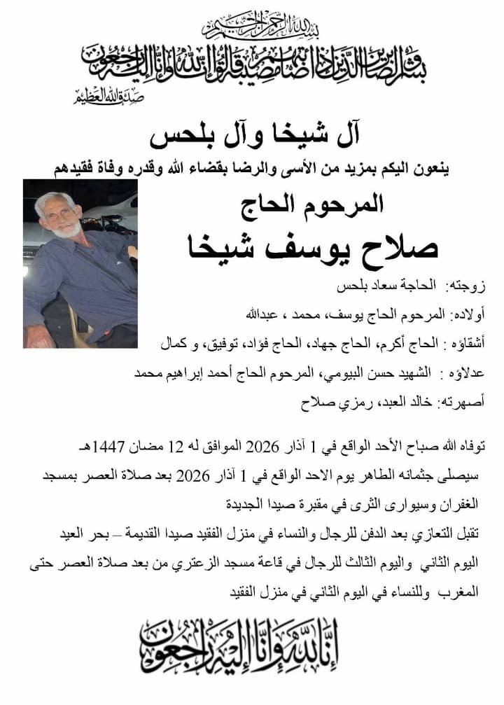 وفاة الحاج صلاح يوسف شيخا، الدفن عصر يوم الاحد في 1 اذار 2026 الأحد 01/آذار/2026 - 01:35 م 3/1/2026 1:35:35 PM شارك