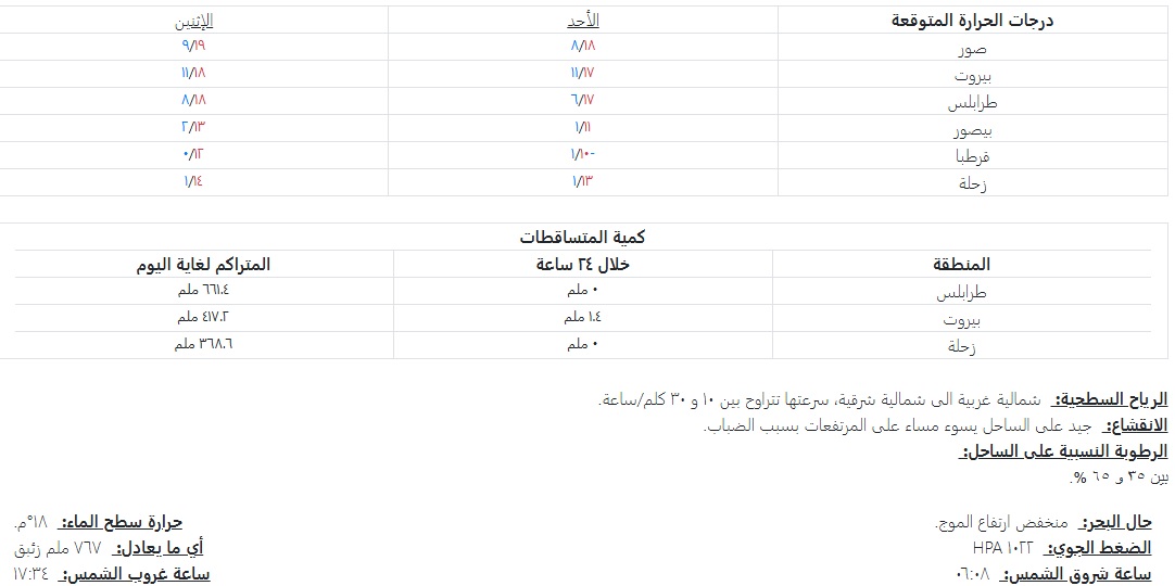 أفادت مصلحة الأرصاد الجوية، أنّ طقساً متقلّباً محلياً وبارداً، يسيطر على لبنان والحوض الشرقي للمتوسّط مع بقاء درجات الحرارة دون معدلاتها الموسمية بسبب سيطرة الرياح الشمالية الباردة، ومن المتوقع أن تتأثر المنطقة مجدداً اعتباراً من ظهر يوم الأربعاء بمنخفض جوي سريع ومتوسط الفعالية مركزه جنوب