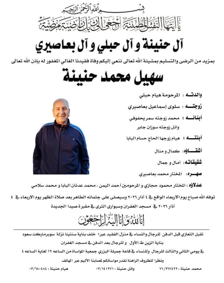 وفاة سهيل محمد حنينة، الدفن ظهر يوم الأربعاء في 4 آذار 2026 الأربعاء 04/آذار/2026 - 10:29 ص 3/4/2026 10:29:54 AM شارك