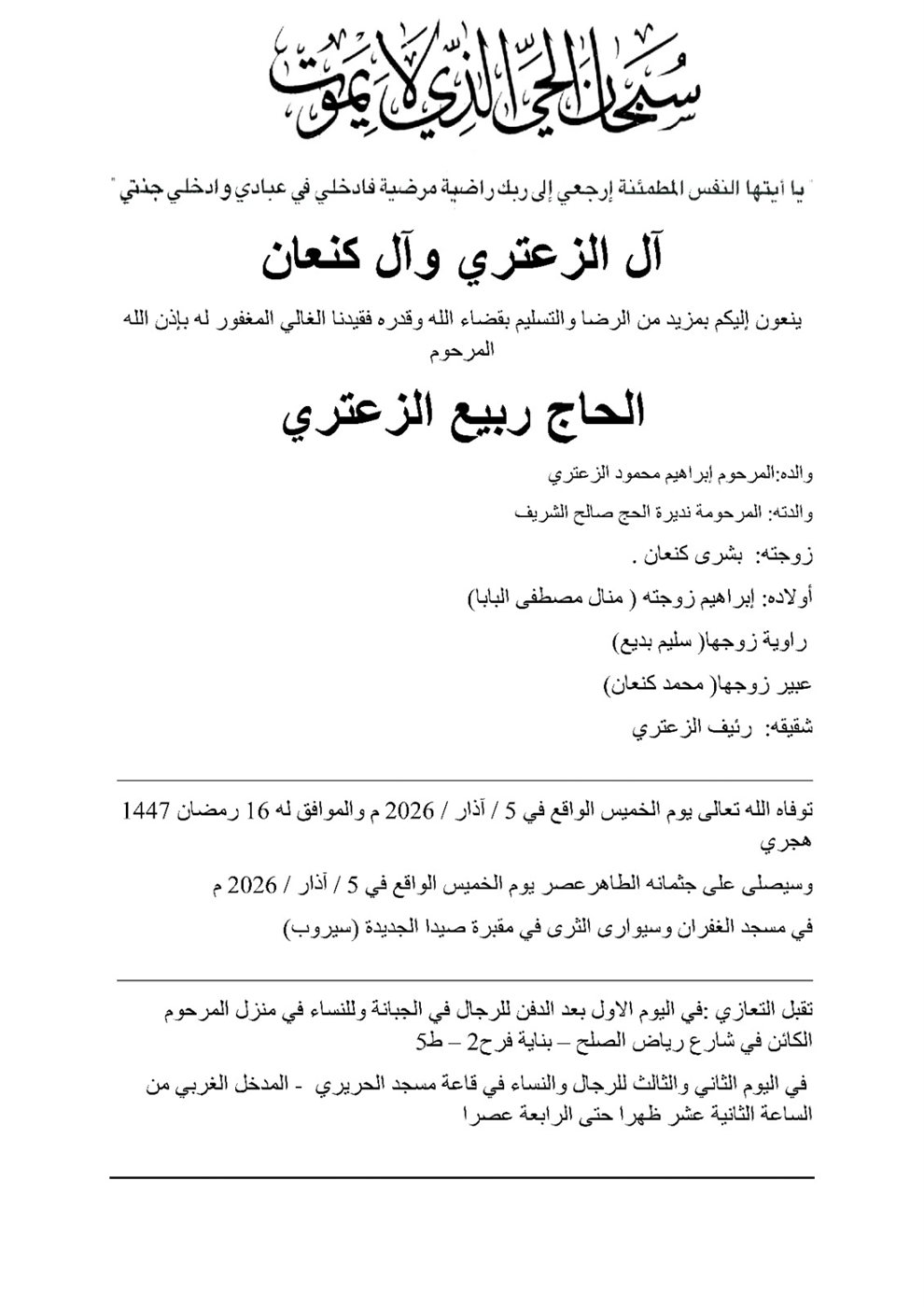 وفاة الحاج ربيع الزعتري، الدفن عصر يوم الخميس في 5 آذار 2026 الخميس 05/آذار/2026 - 01:42 م 3/5/2026 1:42:50 PM شارك