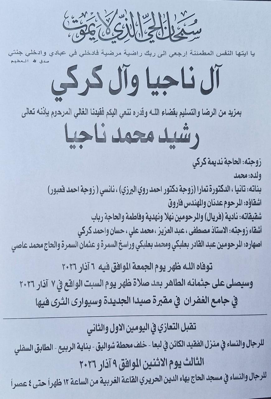وفاة رشيد محمد ناجيا، الدفن ظهر يوم السبت في 7 آذار 2026 الجمعة 06/آذار/2026 - 03:12 م 3/6/2026 3:12:15 PM شارك