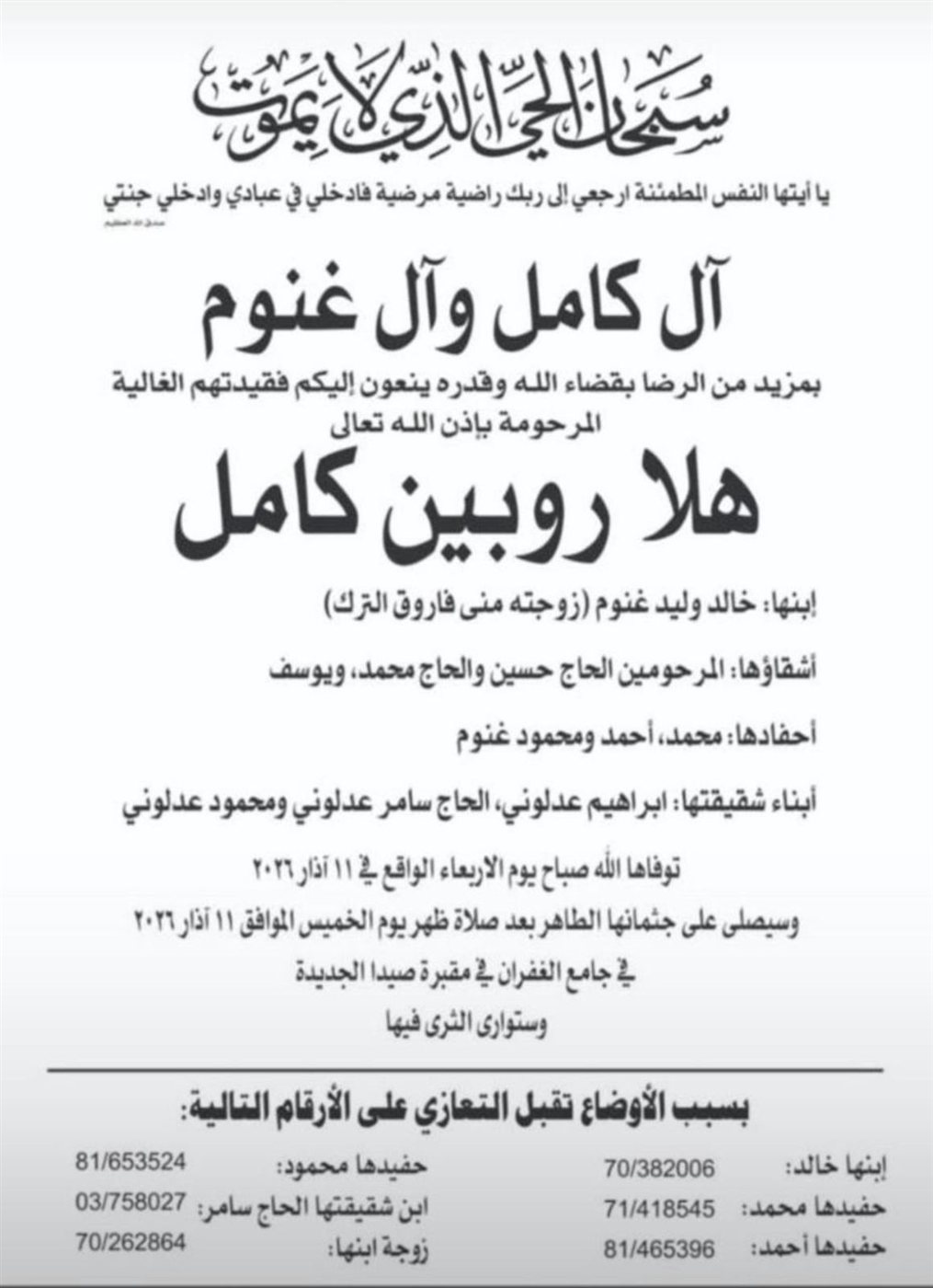 وفاة هلا روبين كامل، الدفن ظهر يوم الخميس في 11 آذار 2026 الأربعاء 11/آذار/2026 - 10:35 م 3/11/2026 10:35:49 PM شارك