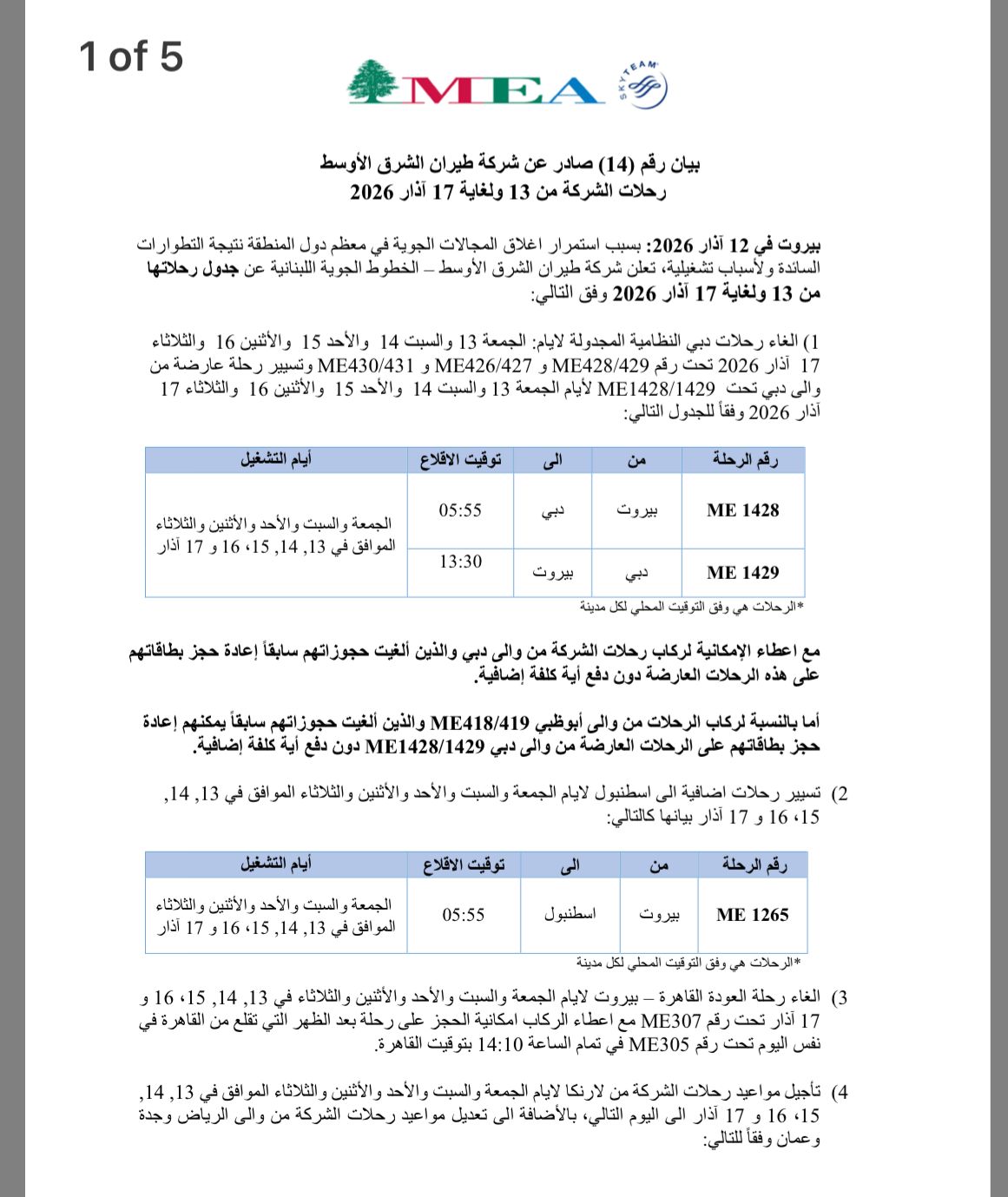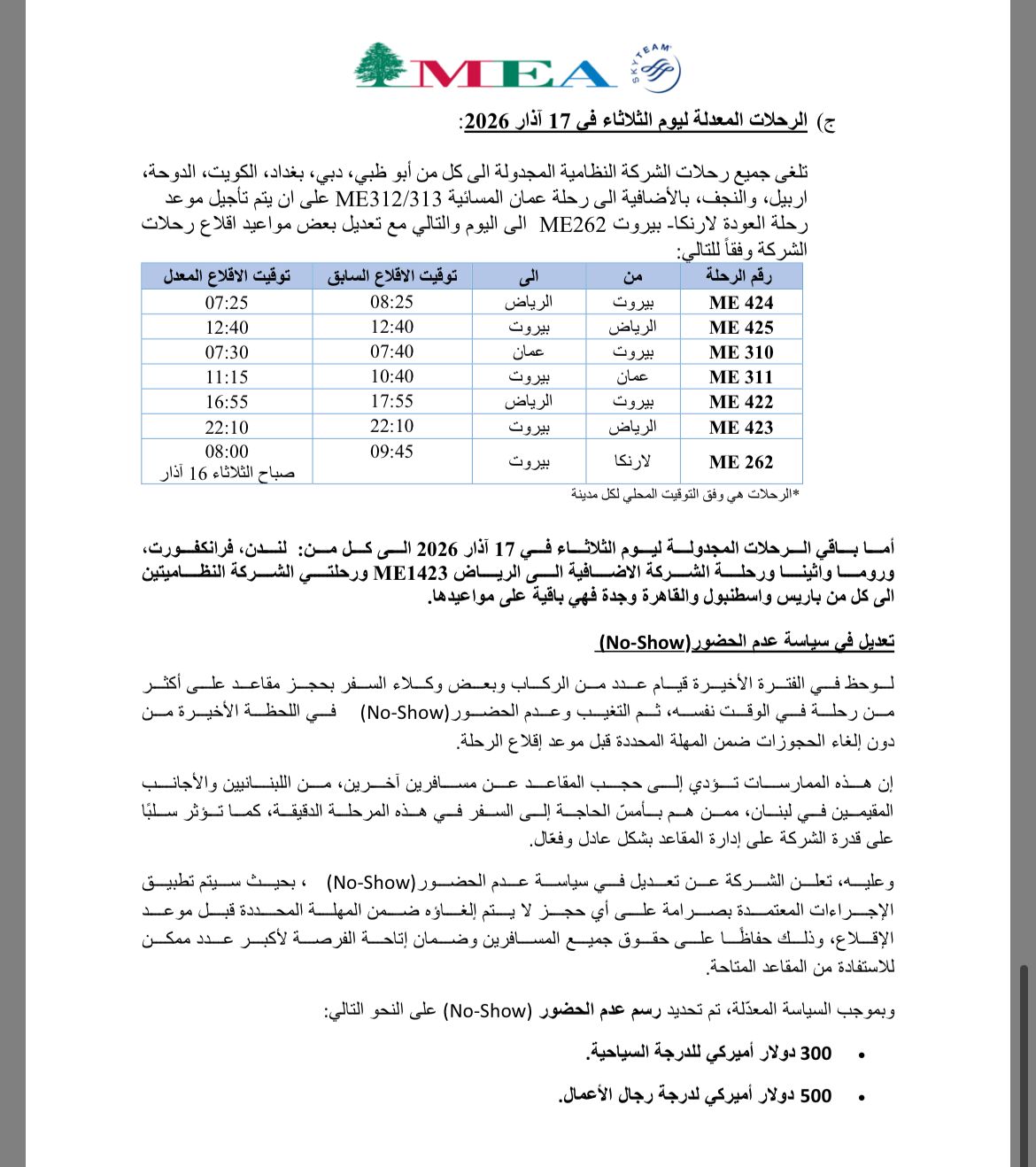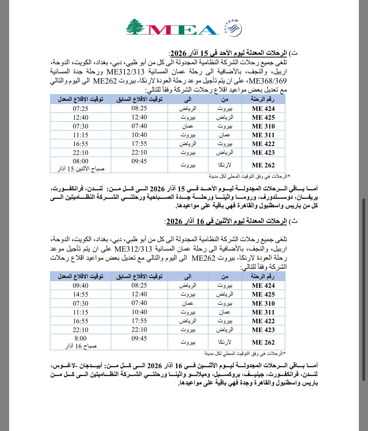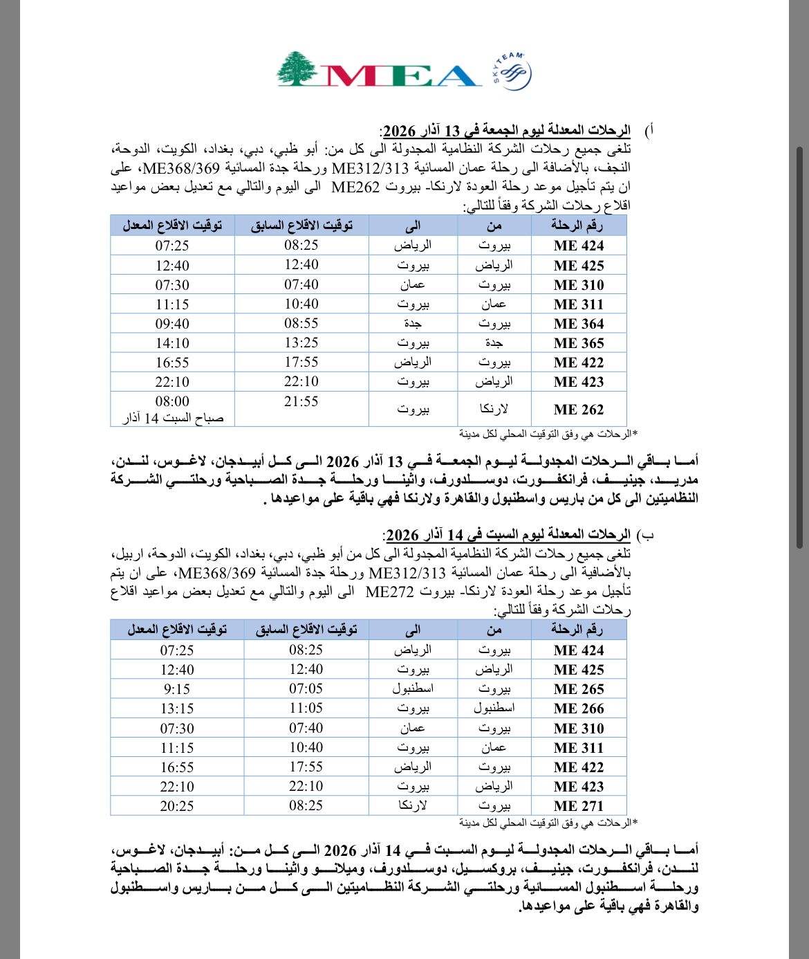 طيران الشرق الأوسط - الخطوط الجوية اللبنانية عن جدول رحلاتها من 13 ولغاية 17 آذار 2026 وفق التالي: