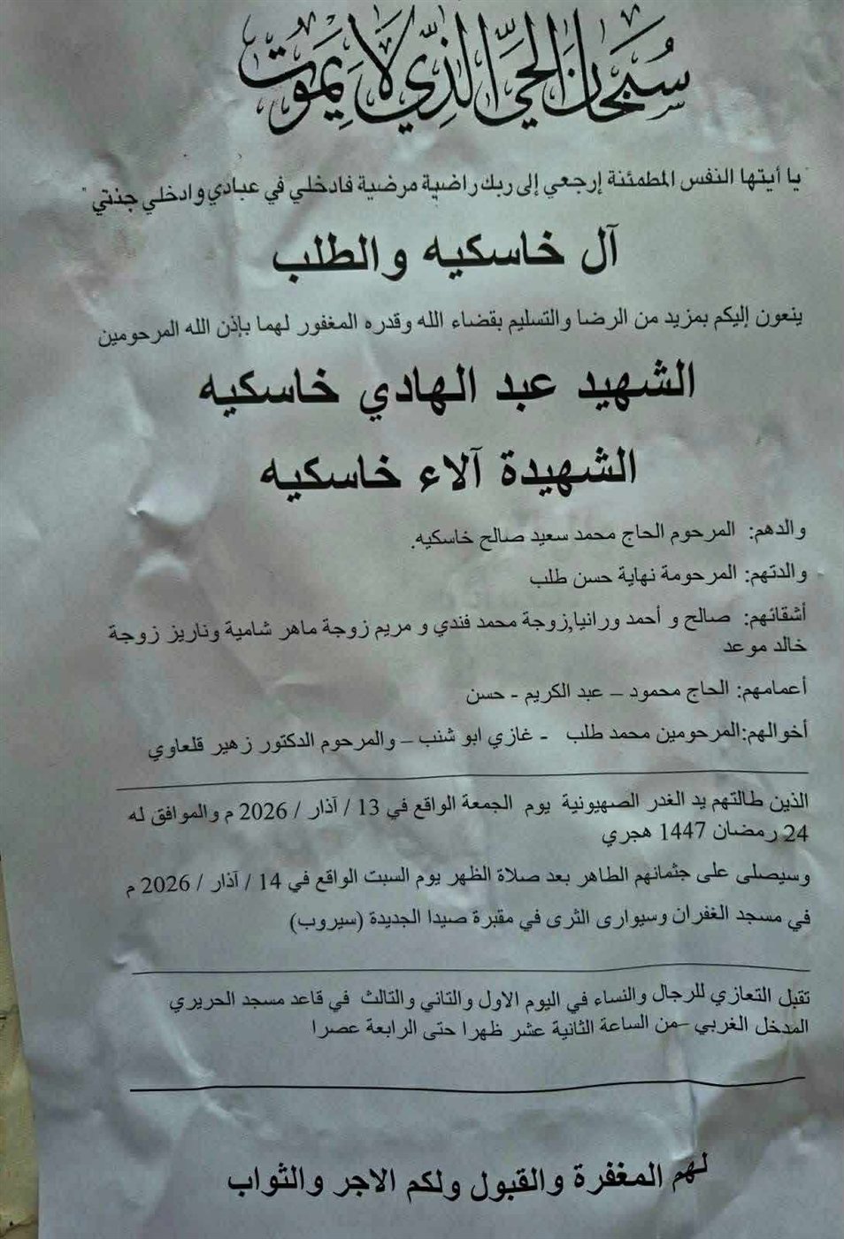 الشهيد عبدالهادي خاسكية، الشهيدة آلاء خاسكية، الدفن ظهر يوم السبت في 14 آذار 2026 الجمعة 13/آذار/2026 - 05:50 م 3/13/2026 5:50:00 PM شارك