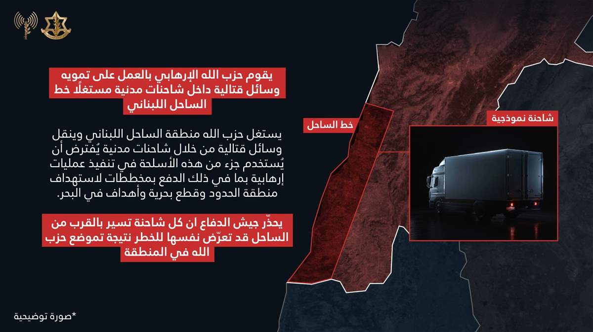 أضاف: "وفقًا لمعلومات استخبارية وصلت إلينا يمكننا الآن الكشف عن قيام حزب الله بالعمل على تمويه وسائل قتالية داخل شاحنات مدنية ويستغل منطقة الساحل اللبناني لنقل وسائل قتالية من خلال شاحنات مدنية".