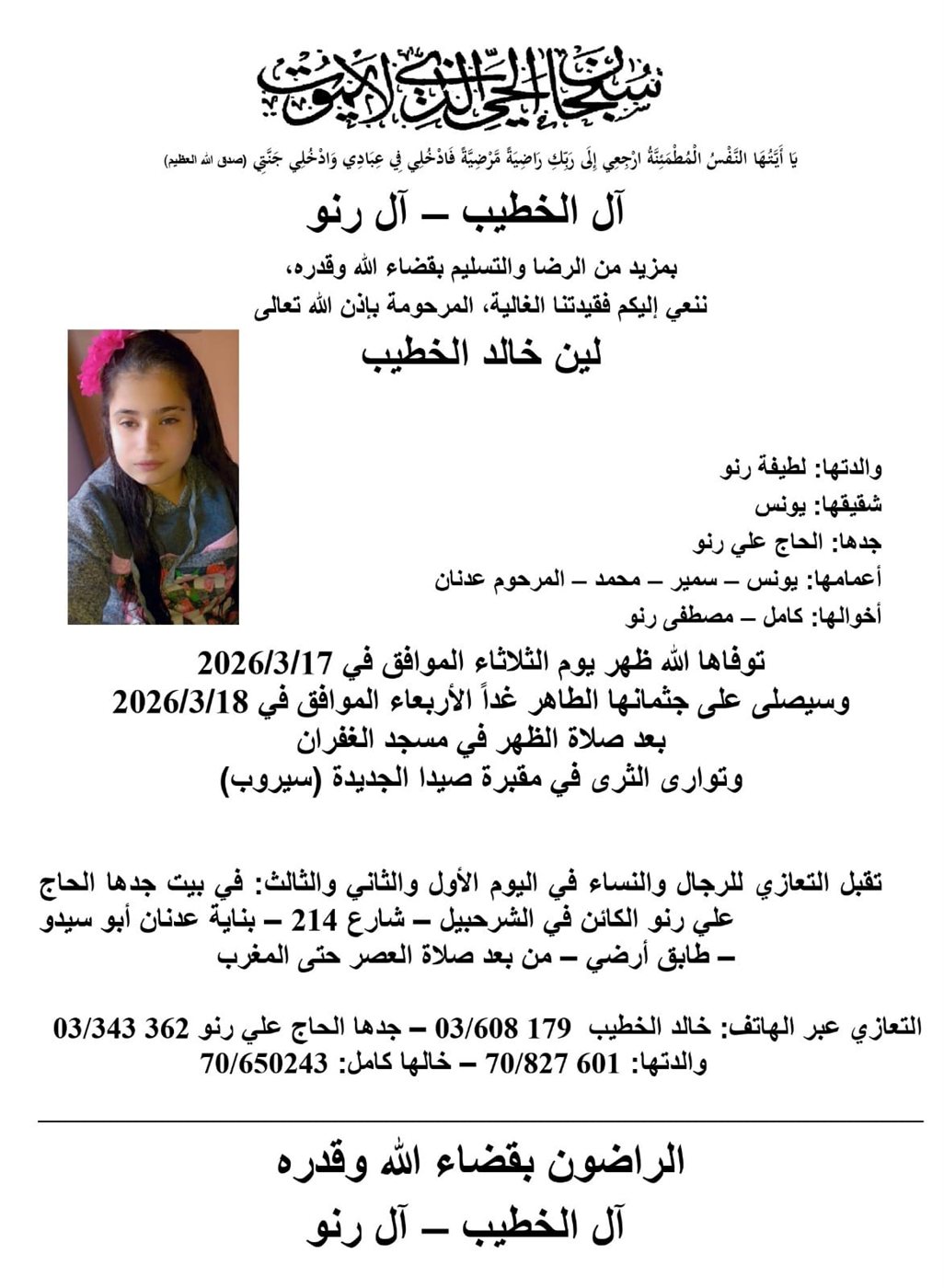 وفاة لين خالد الخطيب، الدفن ظهر يوم الأربعاء في 18 آذار 2026 الثلاثاء 17/آذار/2026 - 09:41 م 3/17/2026 9:41:26 PM شارك