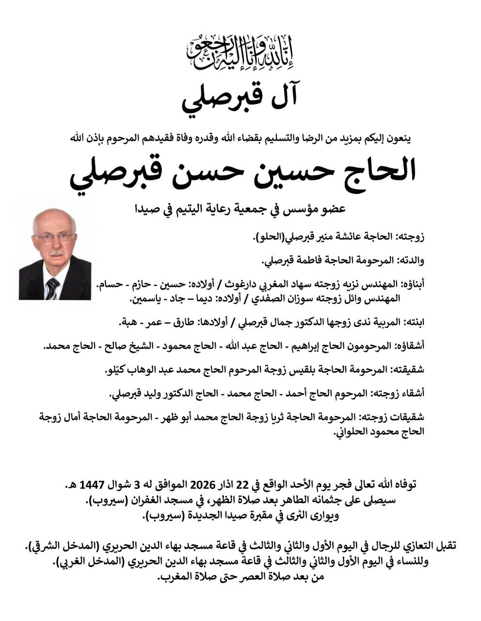 وفاة الحاج حسين حسن قبرصلي (عضو مؤسس في جمعية رعاية اليتيم في صيدا)، الدفن ظهر يوم الاحد في 22 آذار 2026 الأحد 22/آذار/2026 - 09:08 ص 3/22/2026 9:08:16 AM شارك