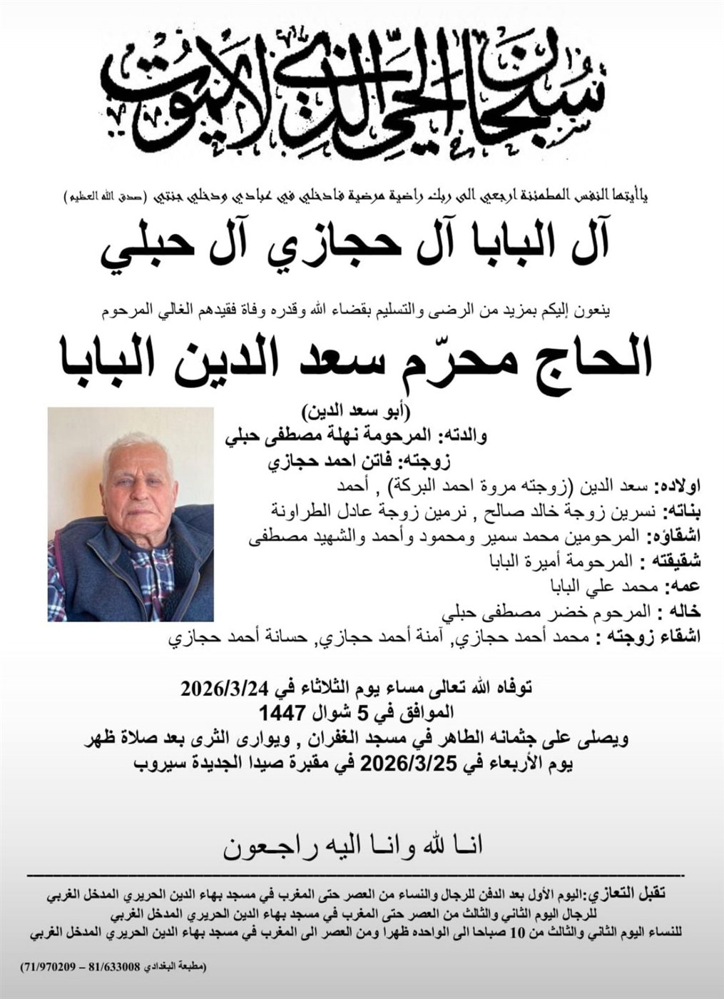 وفاة الحاج محرم سعد الدين البابا، الدفن ظهر يوم الاربعاء في 25 آذار 2026 الأربعاء 25/آذار/2026 - 06:58 ص 3/25/2026 6:58:41 AM شارك