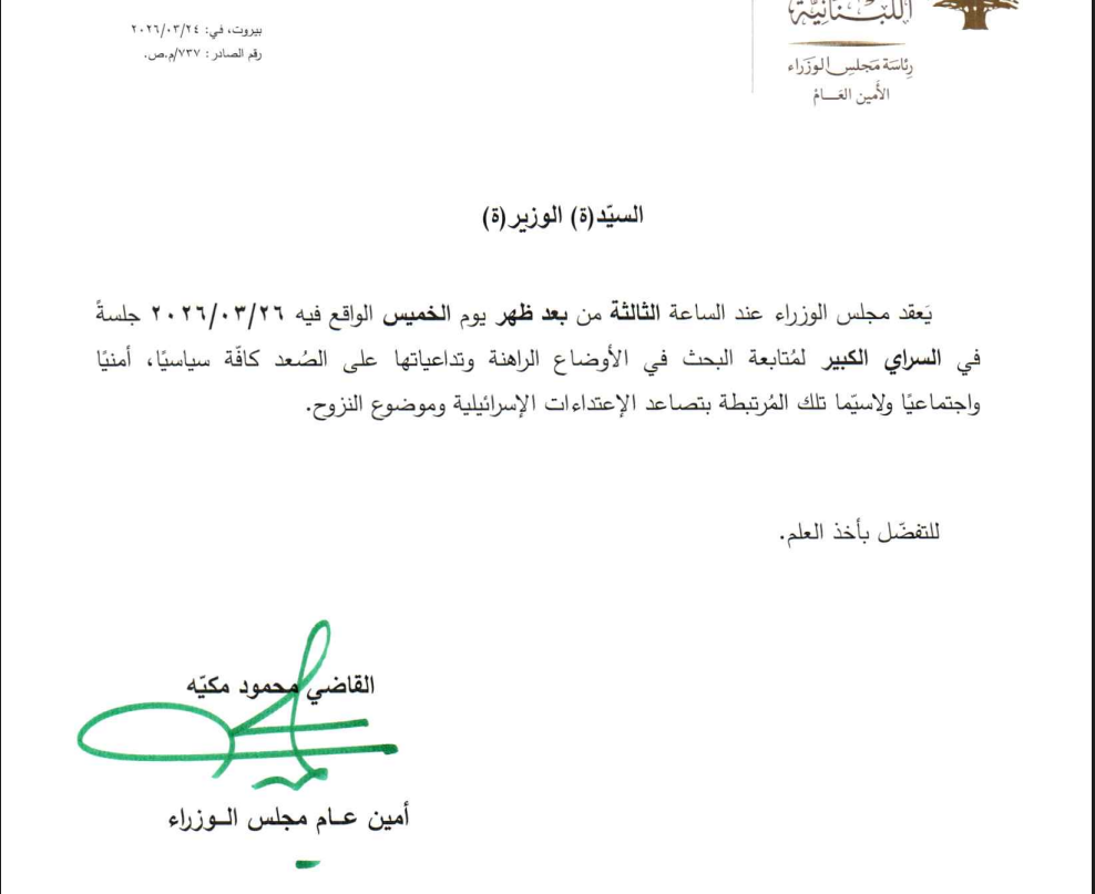 أعلن مجلس الوزراء عن عقد جلسة، غدا الخميس، في السراي الحكومي، الساعة 3 بعد الظهر لبحث الاوضاع الراهنة على الصعد كافة، سياسيا، امنيا، واجتماعيا.