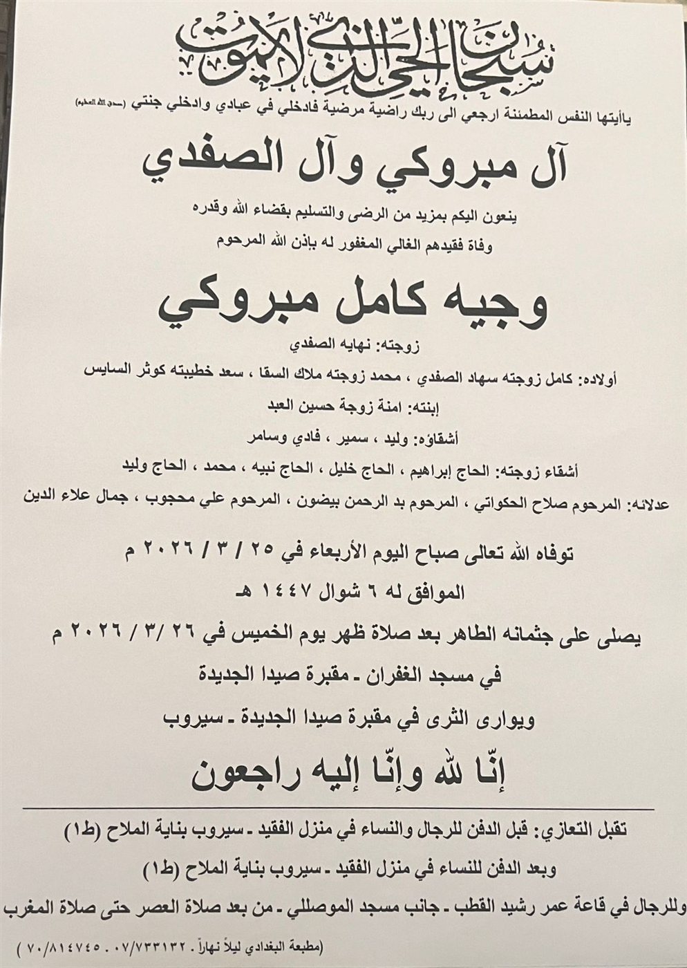 وفاة وجيه كامل مبروكي، الدفن ظهر يوم الخميس في 26 آذار 2026 الأربعاء 25/آذار/2026 - 10:43 م 3/25/2026 10:43:34 PM شارك