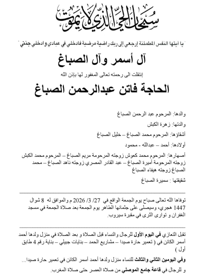 وفاة الحاجة فاتن عبدالرحمن الصباغ، الدفن ظهر يوم الجمعة في 27 آذار 2026 الجمعة 27/آذار/2026 - 12:32 م 3/27/2026 12:32:50 PM شارك