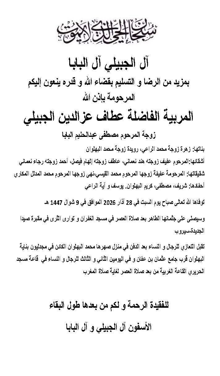 وفاة المربية الفاضلة عطاف عز الدين الجبيلي، الدفن عصر يوم السبت في 28 آذار 2026 السبت 28/آذار/2026 - 12:50 م 3/28/2026 12:50:28 PM شارك