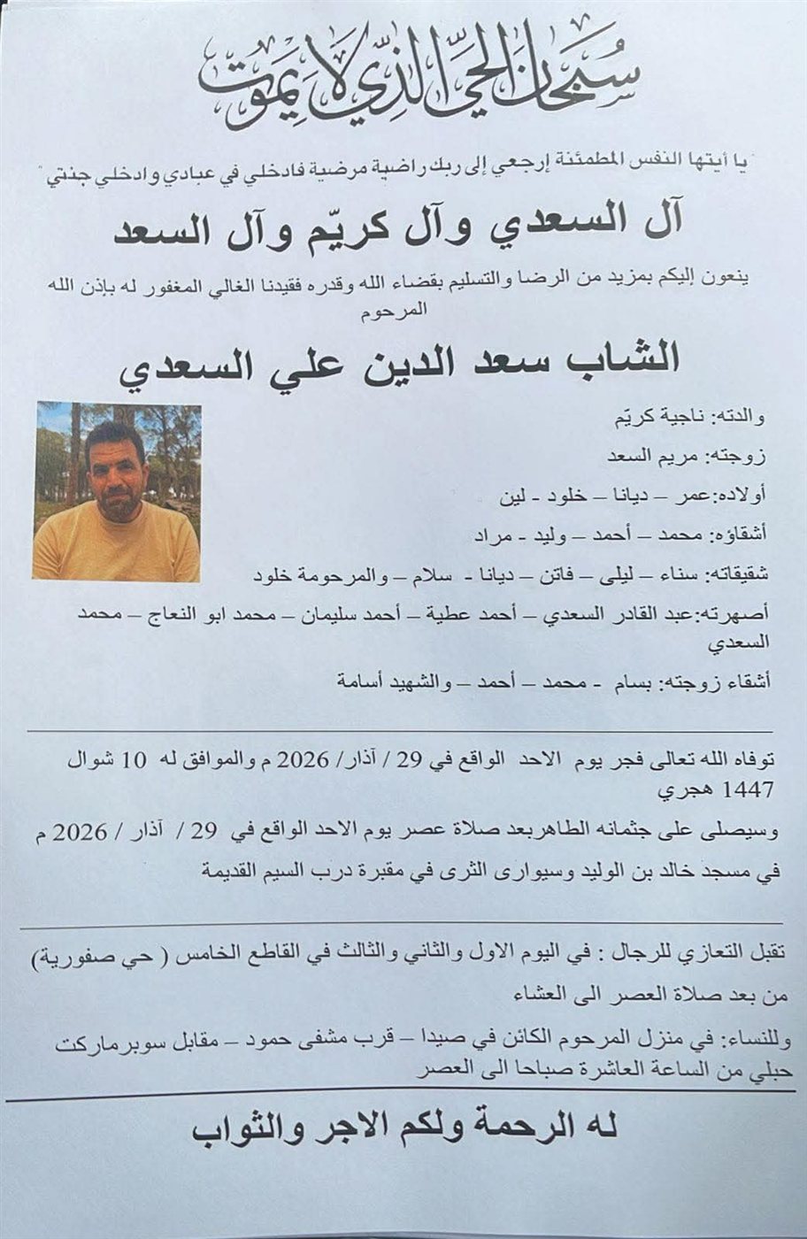 وفاة الشاب سعد الدين علي السعدي، الدفن عصر يوم الاحد في 29 آذار 2026 الأحد 29/آذار/2026 - 02:44 م 3/29/2026 2:44:25 PM شارك
