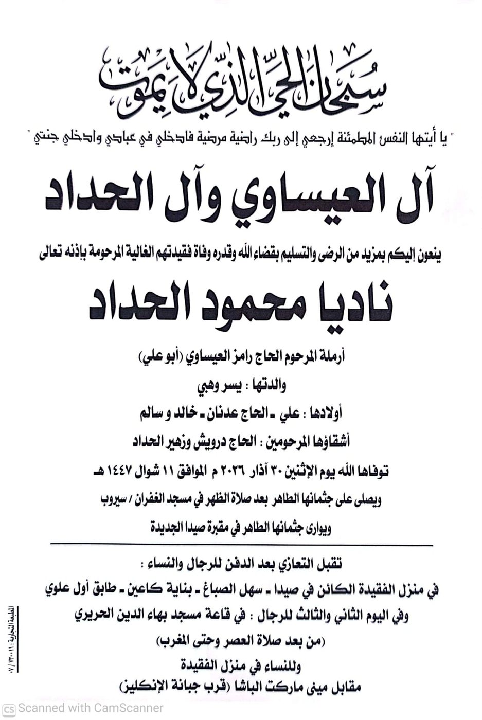 وفاة ناديا محمود الحداد، الدفن ظهر يوم الاثنين في 30 آذار 2026 الإثنين 30/آذار/2026 - 09:51 ص 3/30/2026 9:51:24 AM شارك
