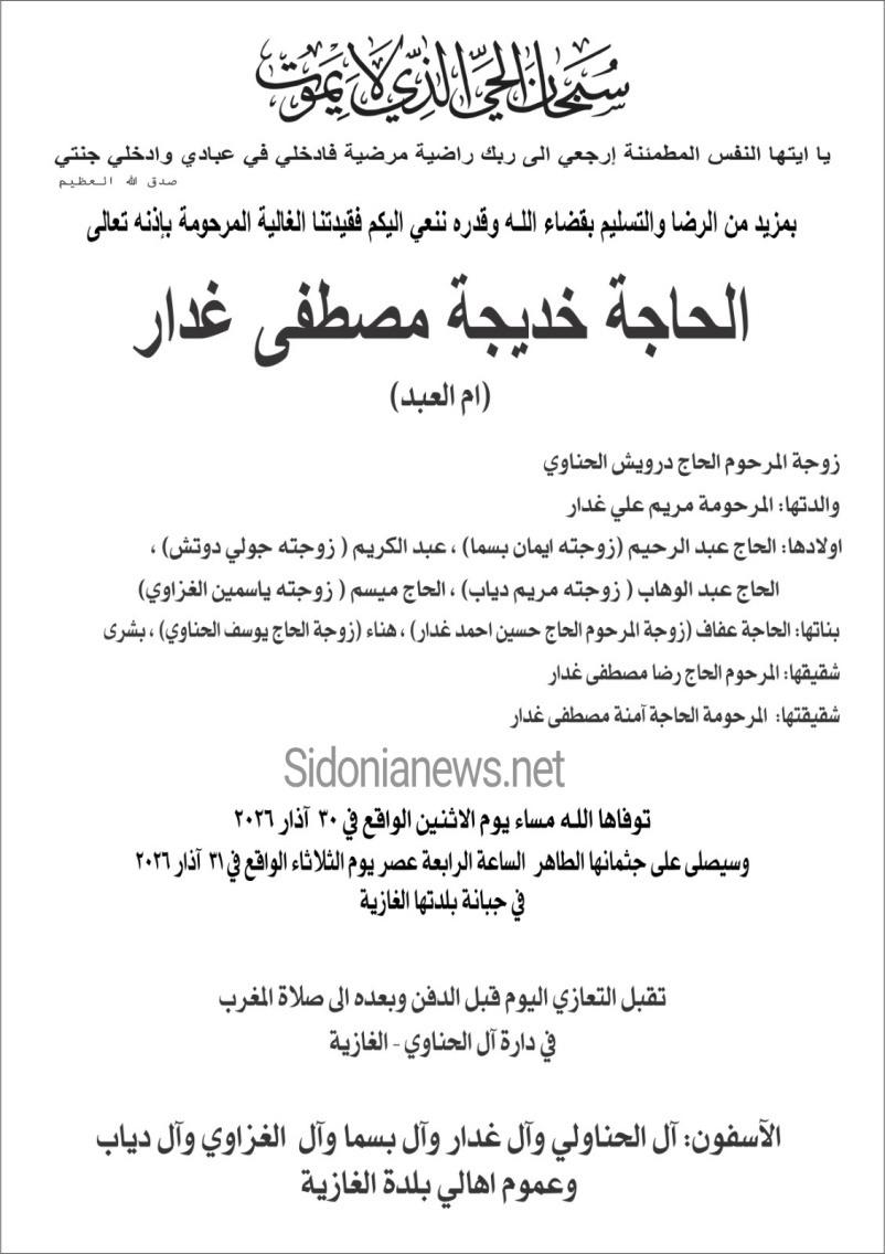 وفاة الحاجة خديجة مصطفى غدار (ام العبد)، الدفن عصر يوم الثلاثاء في 31 آذار 2026 الثلاثاء 31/آذار/2026 - 02:31 م 3/31/2026 2:31:50 PM شارك