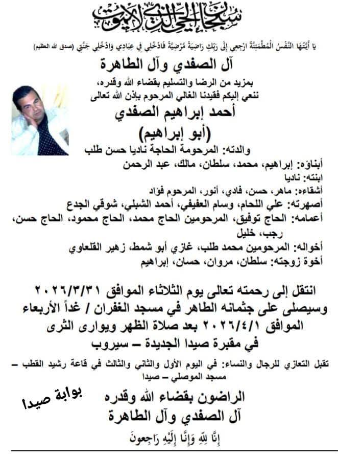 وفاة احمد إبراهيم الصفدي (ابو إبراهيم)، الدفن ظهر يوم الاربعاء في 1 نيسان 2026 الأربعاء 01/نيسان/2026 - 08:17 ص 4/1/2026 8:17:29 AM شارك