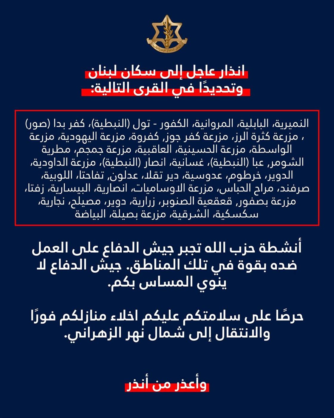 أضاف: "أنشطة حزب الله تجبر الجيش الاسرائيلي على العمل ضده بقوة في تلك المناطق. الجيش الاسرائيلي لا ينوي المساس بكم. حرصًا على سلامتكم عليكم اخلاء منازلكم فورًا والانتقال إلى شمال نهر الزهراني".