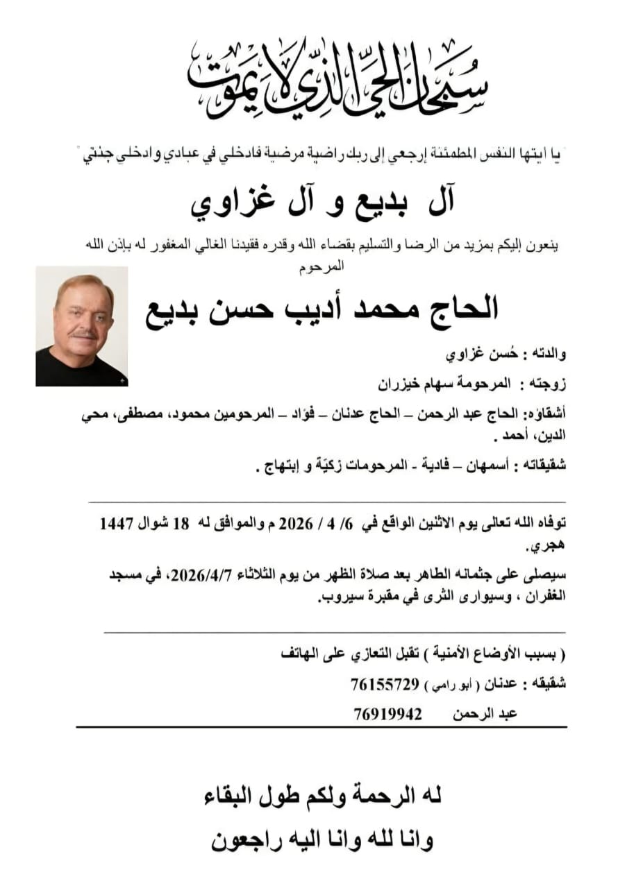 وفاة الحاج محمد اديب حسن بديع، الدفن ظهر يوم الثلاثاء في 7 نيسان 2026 الثلاثاء 07/نيسان/2026 - 11:24 ص 4/7/2026 11:24:16 AM شارك