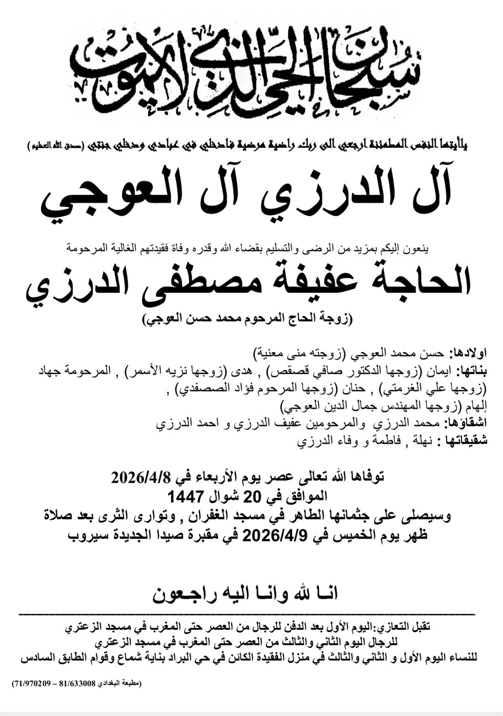 وفاة الحاجة عفيفة مصطفى الدرزي، الدفن ظهر يوم الخميس في 9 نيسان 2026 الأربعاء 08/نيسان/2026 - 08:36 م 4/8/2026 8:36:23 PM شارك