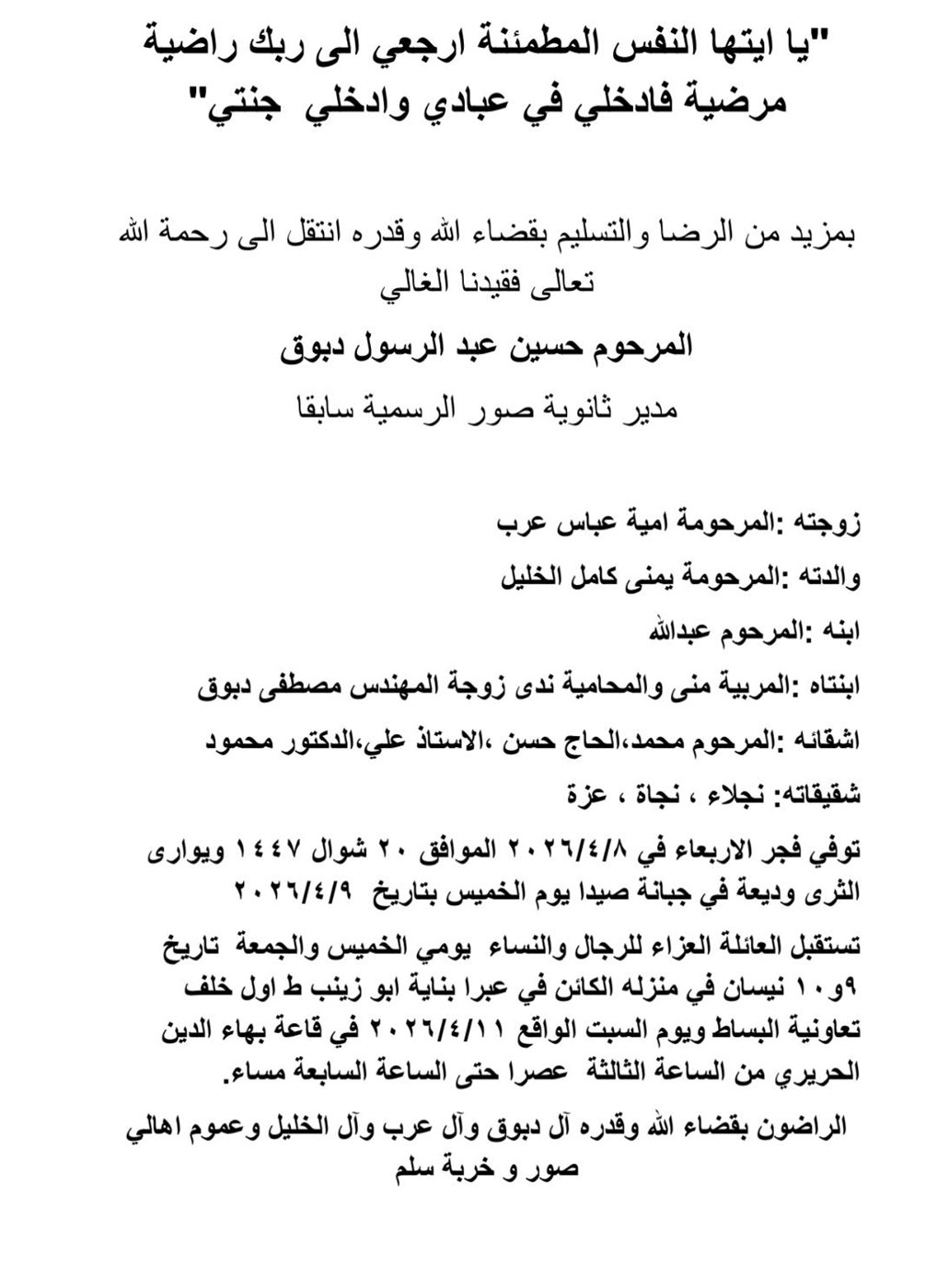 وفاة حسين عبد الرسول دبوق، الدفن يوم الخميس في 9 نيسان 2026 الخميس 09/نيسان/2026 - 10:14 ص 4/9/2026 10:14:15 AM شارك