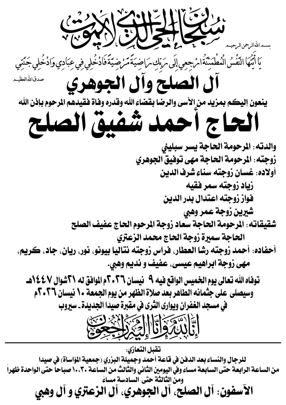 وفاة الحاج احمد شفيق الصلح، الدفن ظهر يوم الجمعة في 10 نيسان 2026 الخميس 09/نيسان/2026 - 12:55 م 4/9/2026 12:55:59 PM شارك
