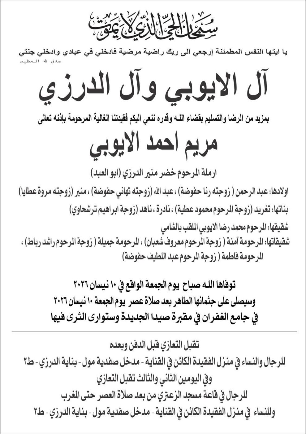 وفاة مريم احمد الايوبي، الدفن عصر يوم الجمعة في 10 نيسان 2026 الجمعة 10/نيسان/2026 - 12:54 م 4/10/2026 12:54:33 PM شارك