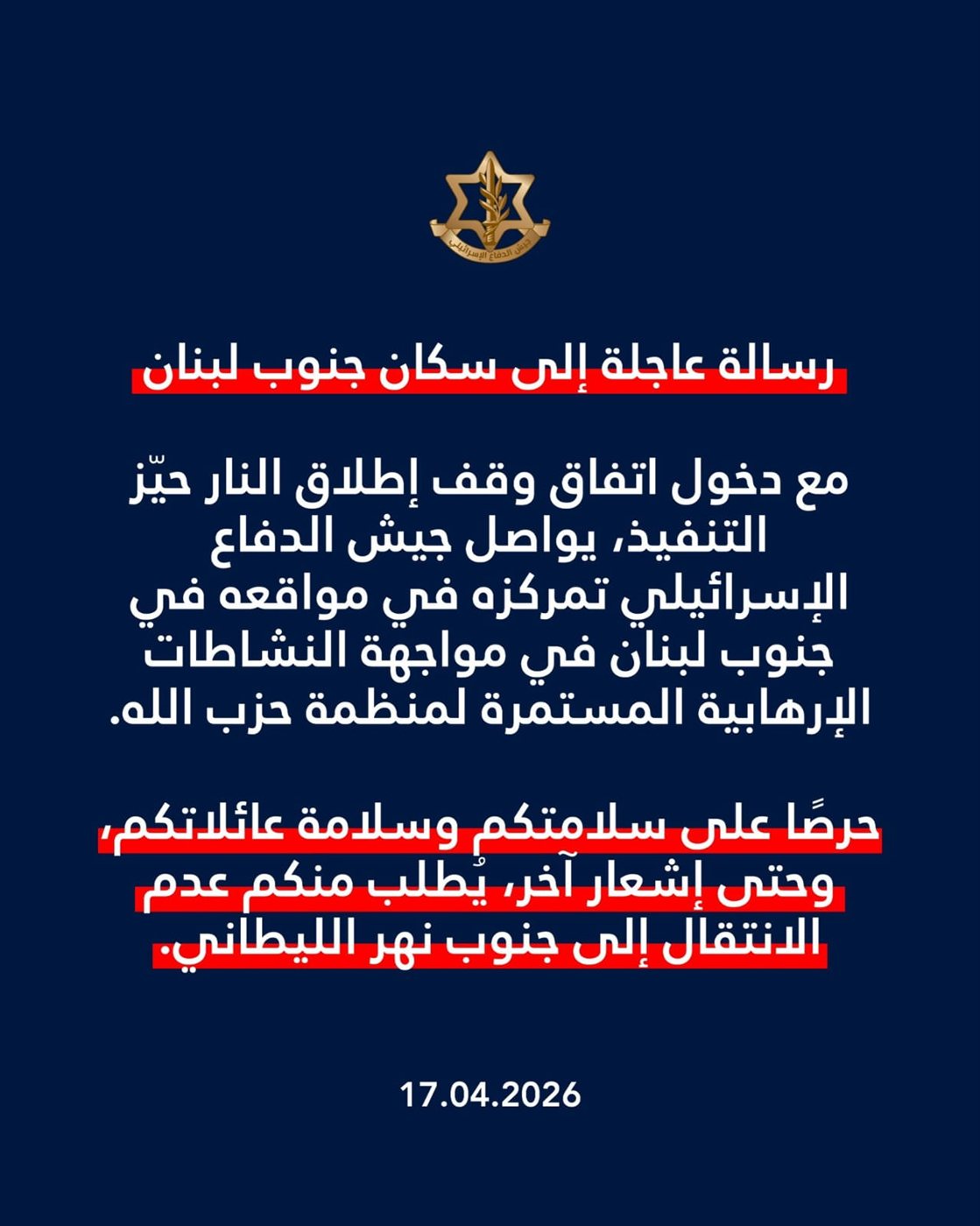 وجه الجيش الإسرائيلي تهديدا إلى سكان جنوب لبنان من أجل عدم الانتقال إلى جنوب الليطاني، وقال إنه "يواصل تمركزه في مواقعه في الجنوب".