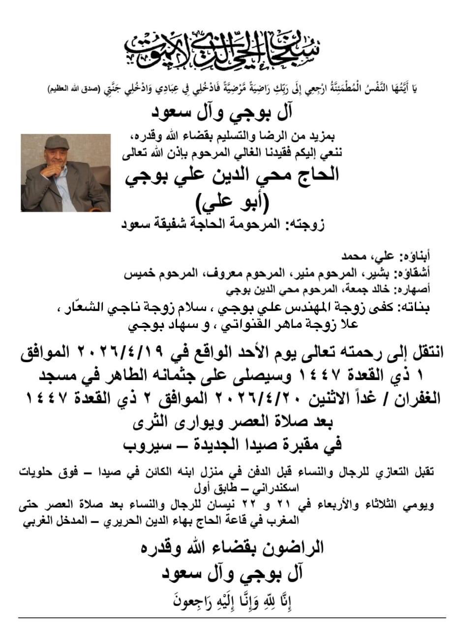وفاة الحاج محي الدين علي بوجي (ابو علي)، الدفن عصر يوم الاثنين في 20 نيسان 2026 الأحد 19/نيسان/2026 - 08:48 م 4/19/2026 8:48:14 PM شارك