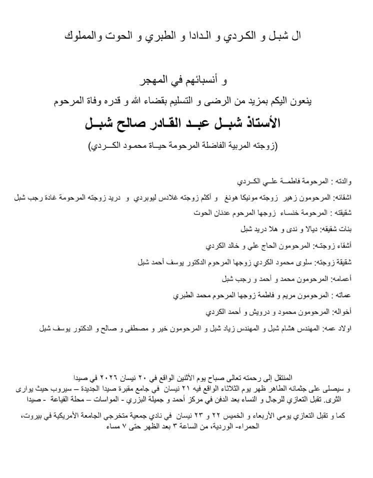 وفاة الأستاذ شبل عبدالقادر صالح شبل، الدفن ظهر يوم الثلاثاء في 21 نيسان 2026 الإثنين 20/نيسان/2026 - 05:46 م 4/20/2026 5:46:19 PM شارك