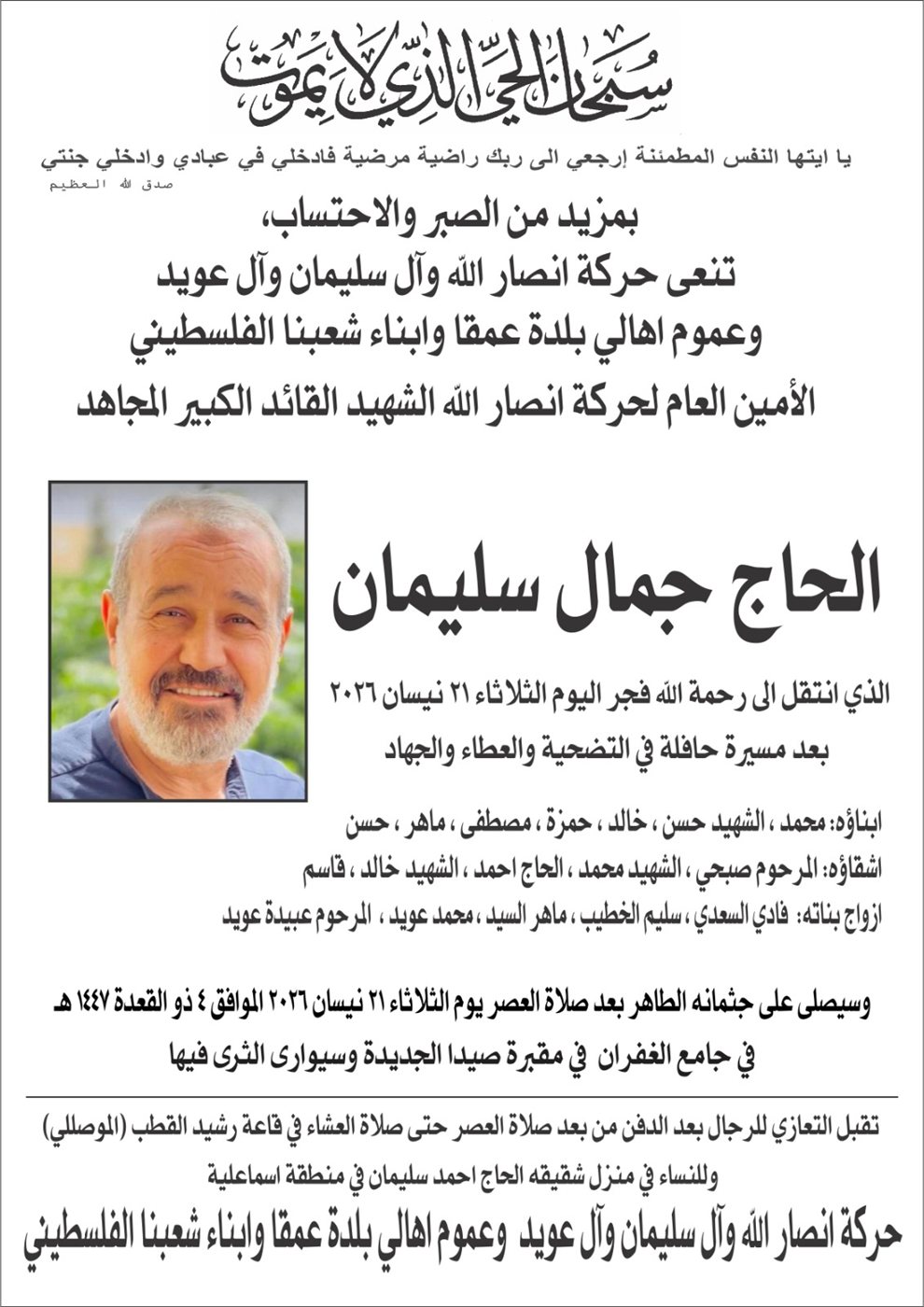 وفاة الحاج جمال سليمان، الدفن عصر يوم الثلاثاء في 21 نيسان 2026 الثلاثاء 21/نيسان/2026 - 10:41 ص 4/21/2026 10:41:51 AM شارك