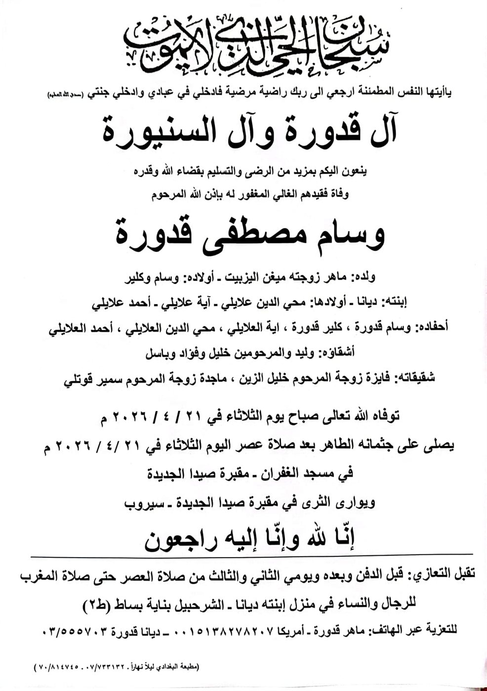 وفاة وسام مصطفى قدورة، الدفن عصر يوم الثلاثاء في 21 نيسان 2026 الثلاثاء 21/نيسان/2026 - 03:28 م 4/21/2026 3:28:46 PM شارك