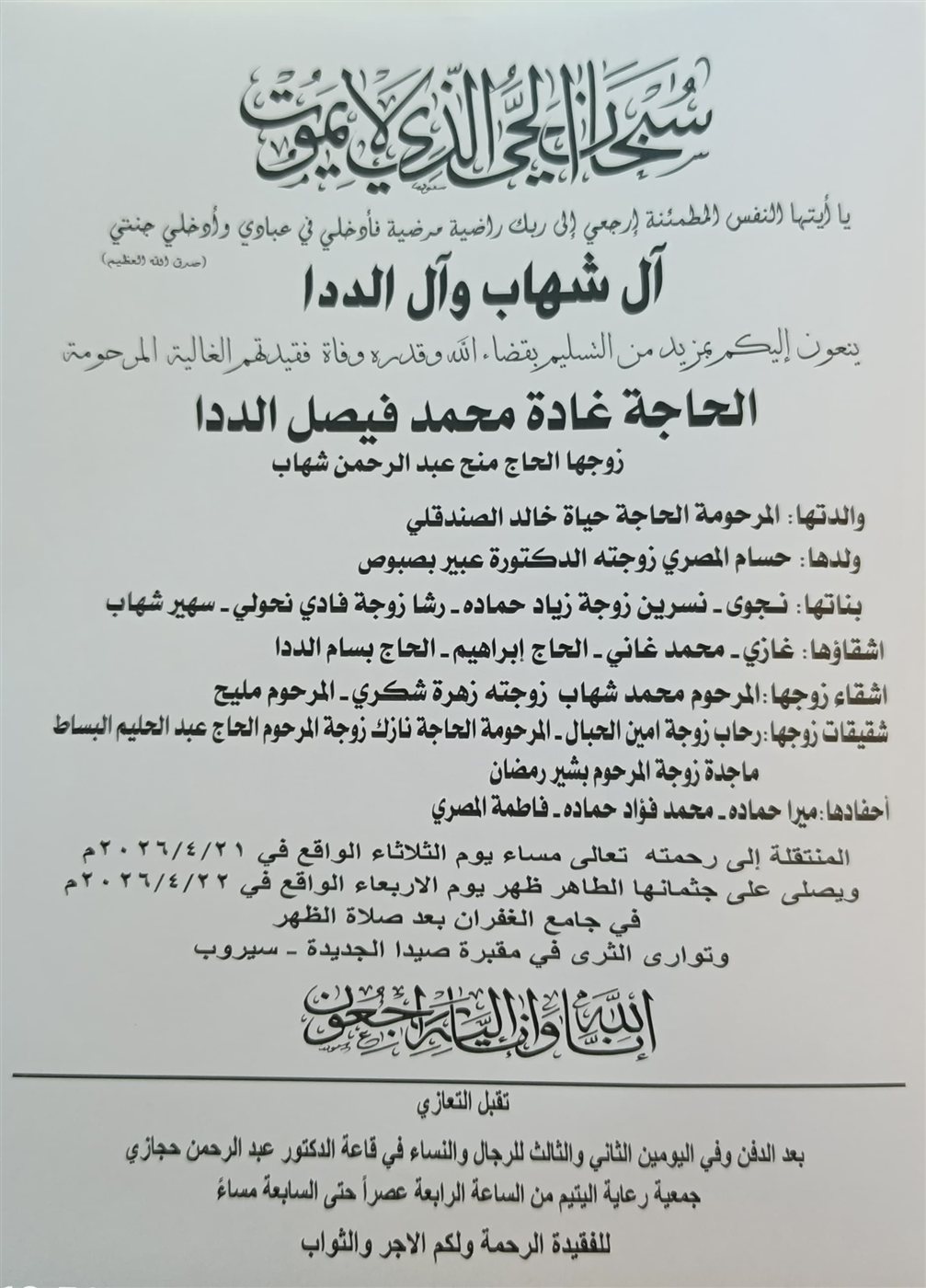 وفاة الحاجة غادة محمد فيصل الددا، الدفن ظهر يوم الأربعاء في 22 نيسان 2026 الثلاثاء 21/نيسان/2026 - 06:18 م 4/21/2026 6:18:50 PM شارك