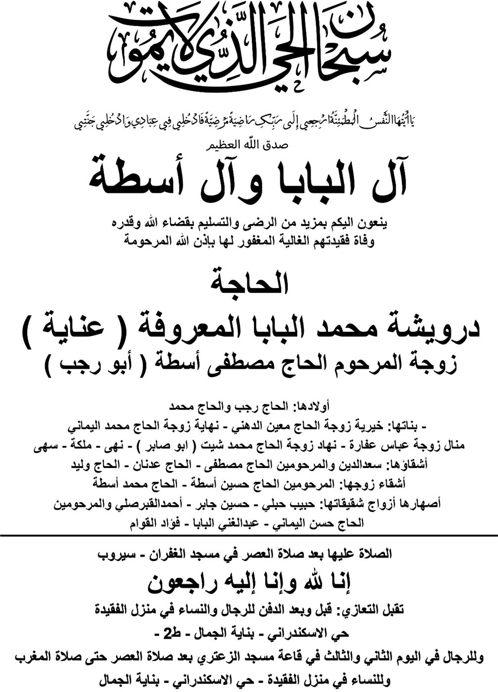 وفاة درويشة محمد البابا المعروفة (عناية)، الدفن عصر يوم الأربعاء في 22 نيسان 2026 الأربعاء 22/نيسان/2026 - 11:11 ص 4/22/2026 11:11:28 AM شارك