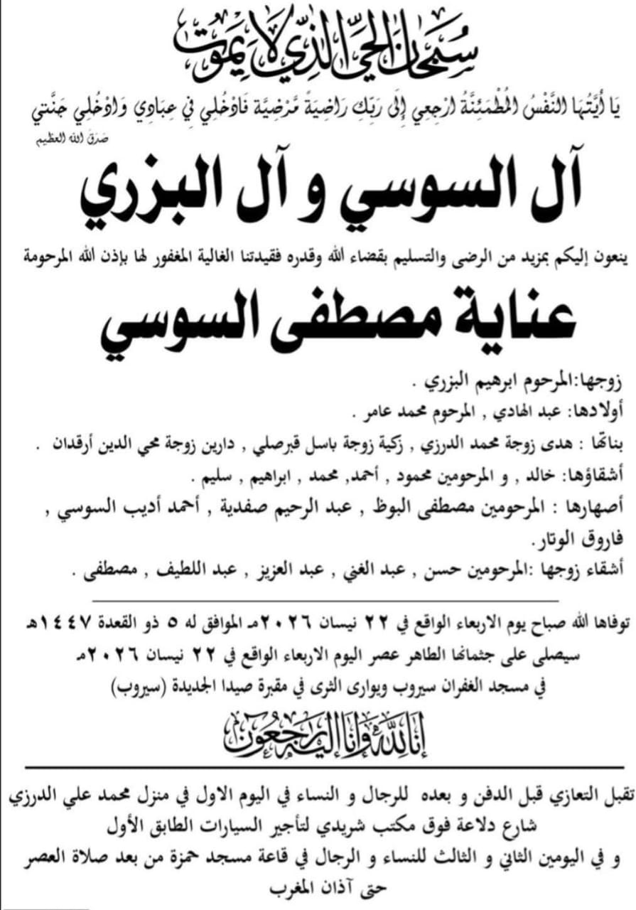 وفاة عناية مصطفى السوسي، الدفن عصر يوم الأربعاء في 22 نيسان 2026 الأربعاء 22/نيسان/2026 - 11:14 ص 4/22/2026 11:14:31 AM شارك