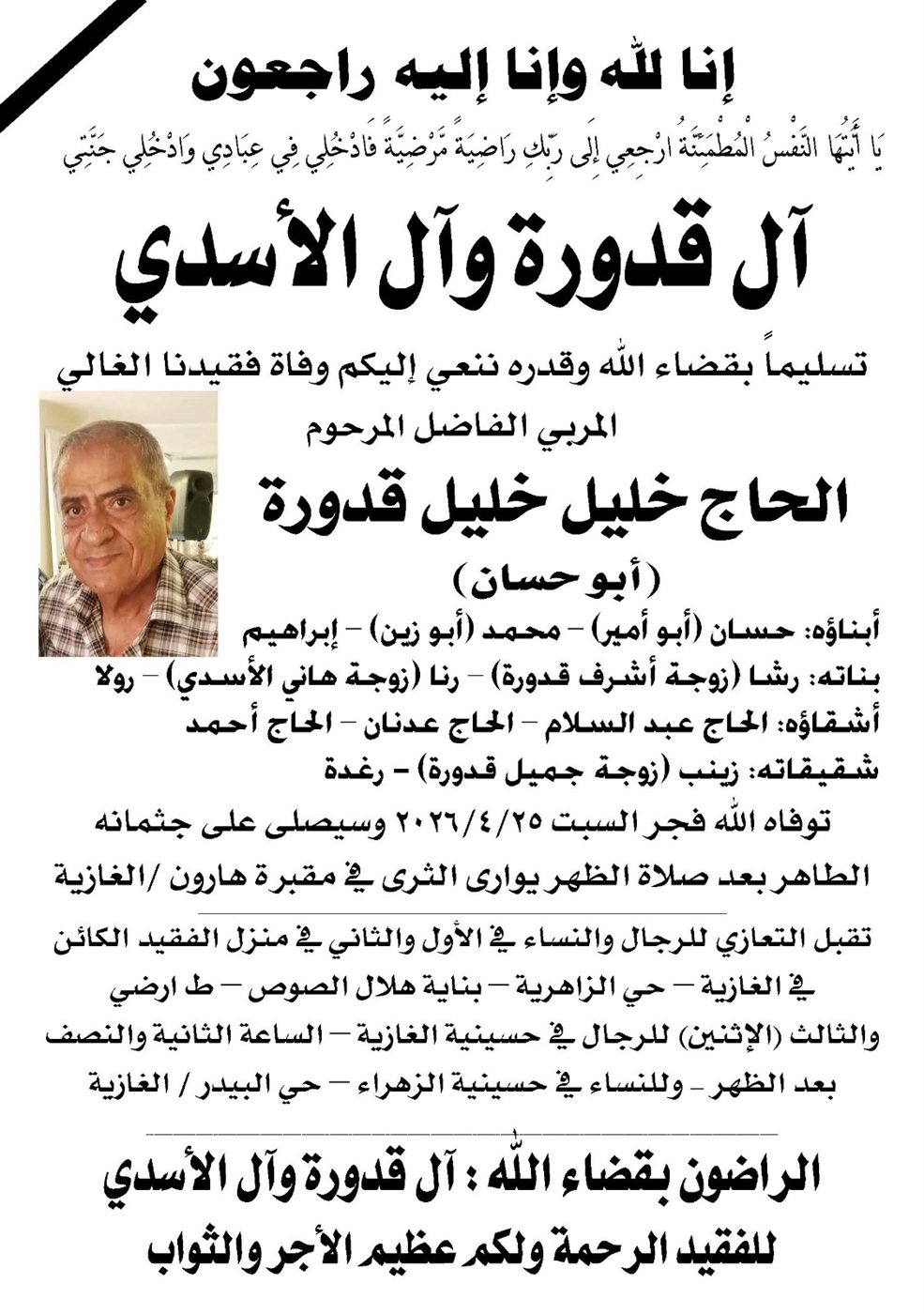 وفاة الحاج خليل خليل قدورة (ابو حسان)، الدفن ظهر يوم السبت في 25 نيسان 2026 السبت 25/نيسان/2026 - 11:33 ص 4/25/2026 11:33:12 AM شارك