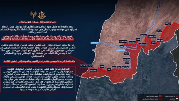 كما حذر من الاقتراب من نهر الليطاني ووادي الصلحاني والسلوقي، مشددا على عدم العبور أو العودة إلى عدد كبير من القرى الحدودية وهي: البياضة، شاما، طير حرفا, ابو شاش، الجبين، الناقورة، ظهيرة، مطمورة, يارين، الجبين, ام توته، الزلوطية، بستان ،شیحین ،مروحين, راميه (بنت جبيل), بيت ليف، صلحانة, عيتا الشعب, حنين، الطيري، رشاف، یارون، مارون الرأس، بنت جبيل، عيناتا، كونين, عيترون، بليدا، محيبب، ميس الجبل، قلعة دبا, حولا, مركبا، طلوسة, بني حيان، رب الثلاثين, العديسة مرجعيون, كفر كلا، الطيبة (مرجعيون)، دير سریان, قنطرة، علمان (مرجعيون), عدشيت القصير، القصير، ميسات, لبونة, اسكندرونة, شمعا, ججيم, الضهيرة, يرين, خربة الكسيف, دير سريان, الخيام, صليب, مزرعة سردة, مجيدية