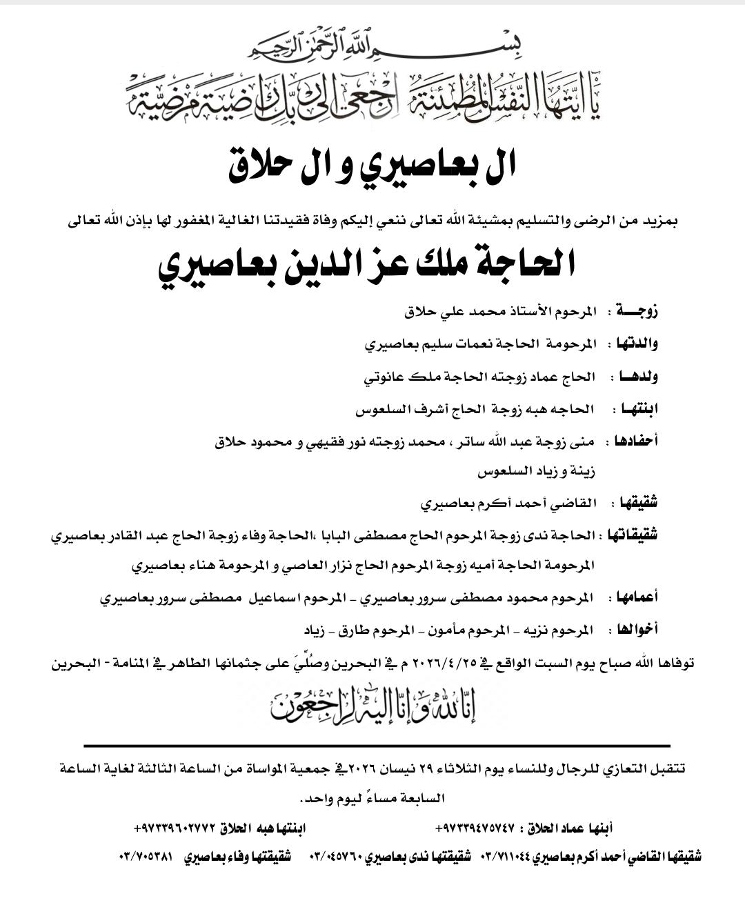 وفاة الحاجة ملك عز الدين بعاصيري، الدفن في المنامة- البحرين الأحد 26/نيسان/2026 - 12:23 م 4/26/2026 12:23:34 PM شارك