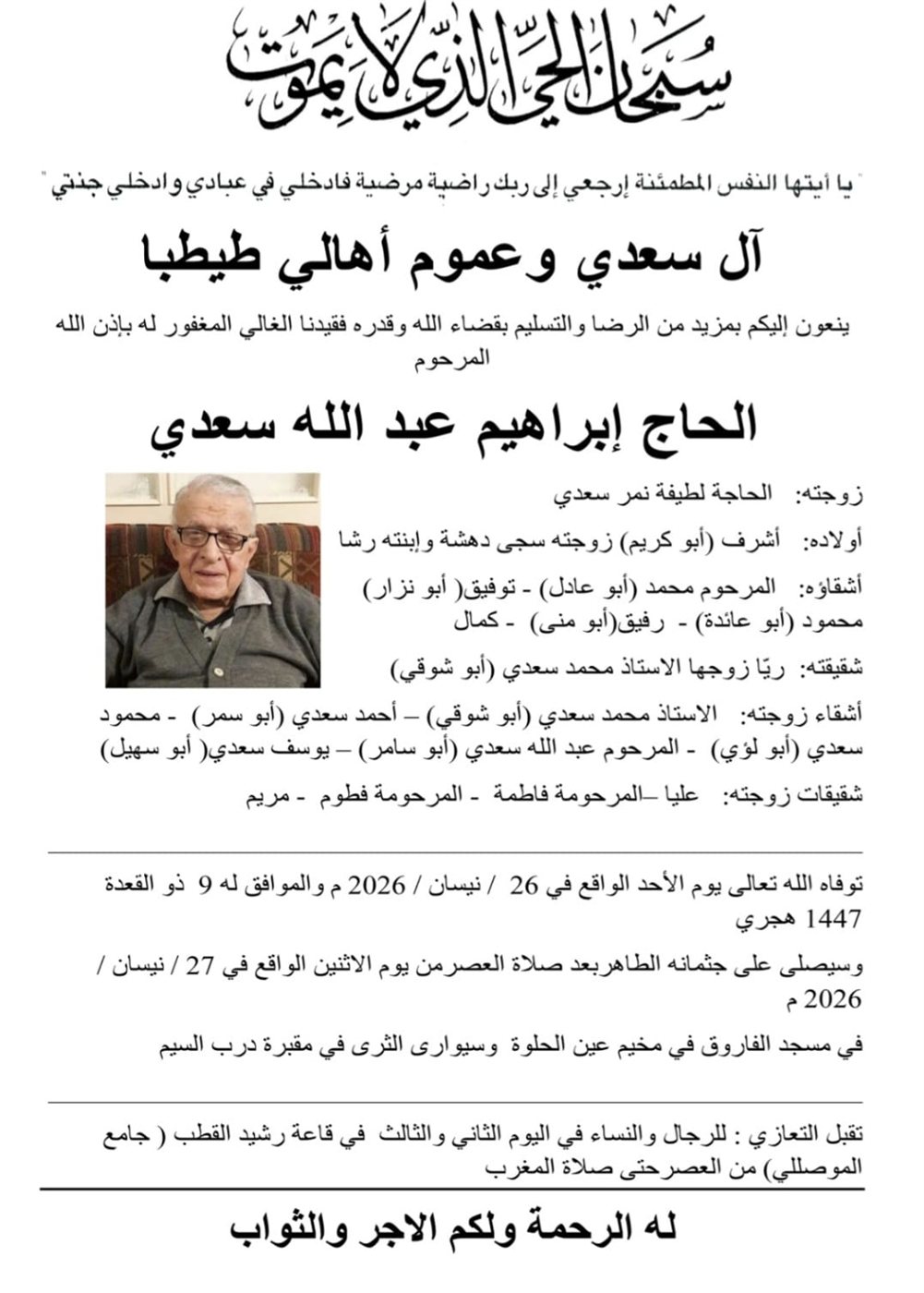 وفاة الحاج ابراهيم عبدالله السعدي، الدفن عصر يوم الاثنين في 27 نيسان 2026 الأحد 26/نيسان/2026 - 09:19 م 4/26/2026 9:19:38 PM شارك