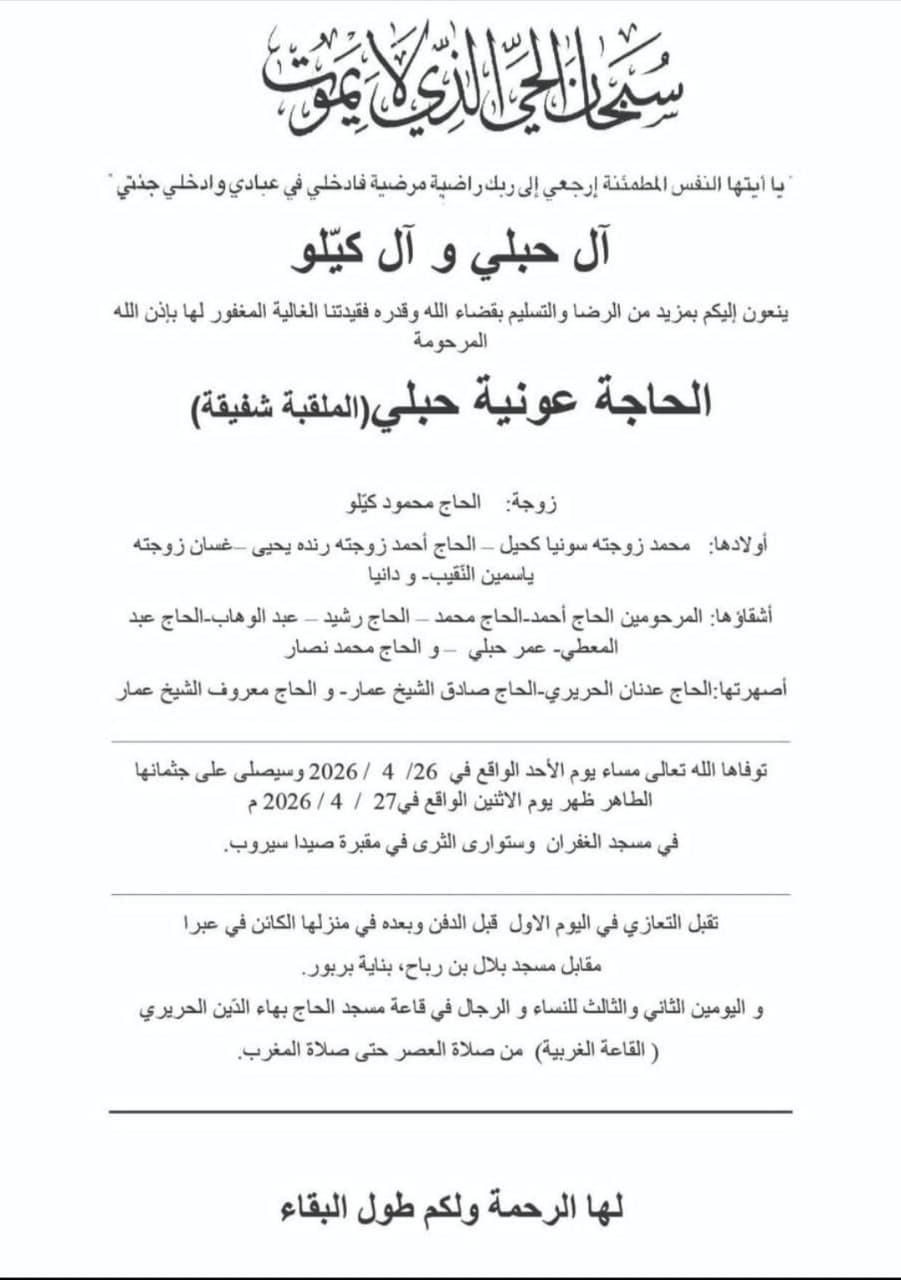 وفاة الحاجة عونية حبلي (الملقبة شفيقة)، الدفن ظهر يوم الاثنين في 27 نيسان 2026 الإثنين 27/نيسان/2026 - 11:50 ص 4/27/2026 11:50:26 AM شارك
