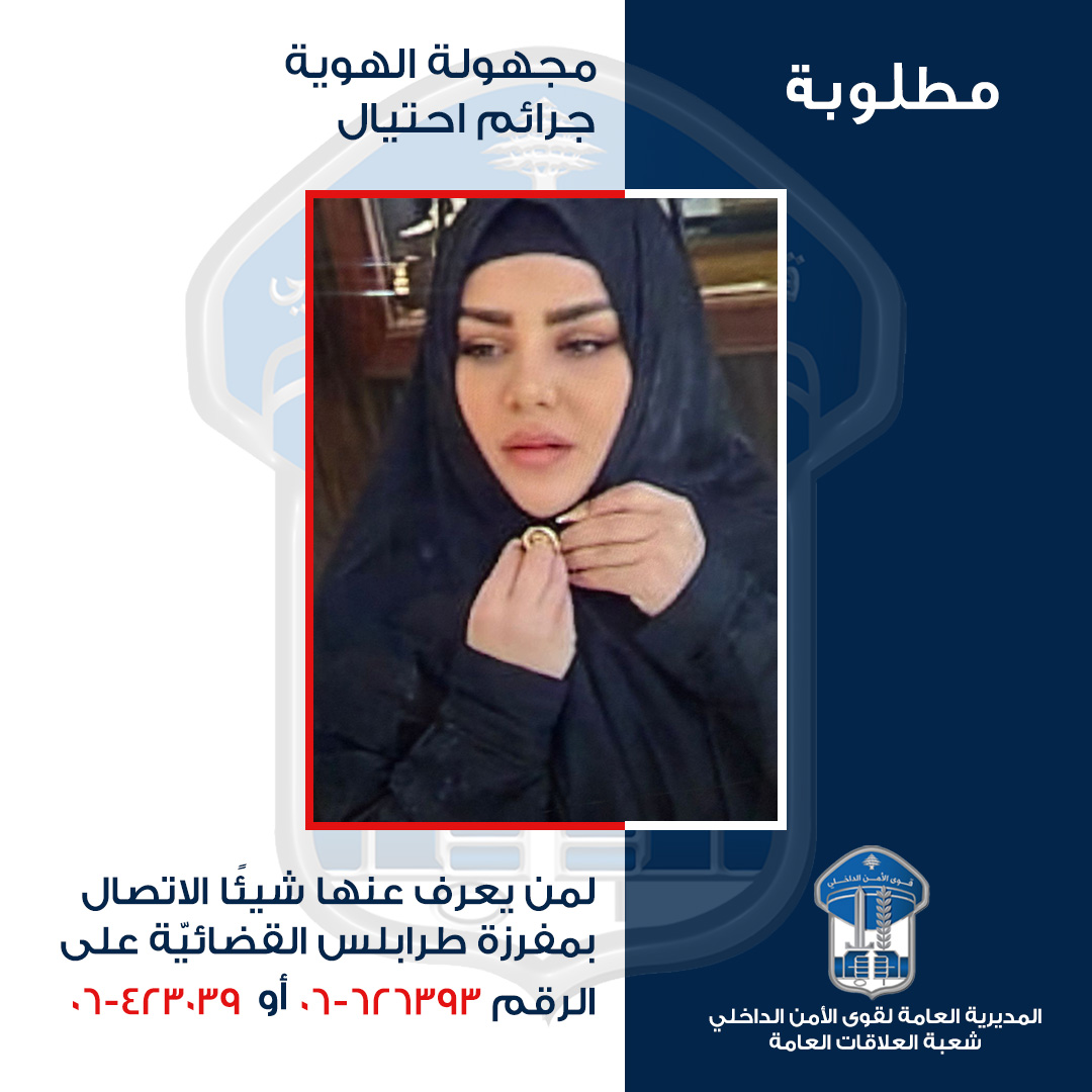 "بناءً على إشارة القضاء المختصّ، تُعمّم المديريّة العامّة لقوى الأمن الدّاخلي، صورة سيّدة مجهولة الهويّة، للاشتباه بتنفيذها عمليّات احتياليّة في مدينة طرابلس وضواحيها، بحيث قامت ببيع أونصة ذهبيّة مغشوشة بطريقة احترافية إلى أحد مالكي محال المجوهرات في طرابلس، بعد أن أوهمته بأنّها أصليّة.