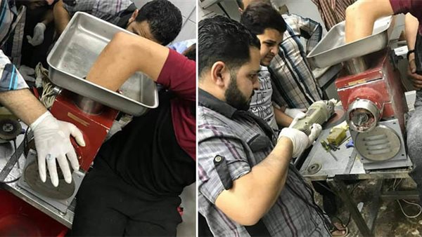 استقبل مستشفي الطوارئ بال"منصورة"، شاب يعمل بمحل جزارة انزلقت يده داخل ماكينة الفرم وأصيبت كف يده بالفرم بين أجزاء الماكينة وهو فى حالة صدمة وتم عمل الاسعافات الاولية له لحين استخراج يده من بين أجزاء الماكينة.