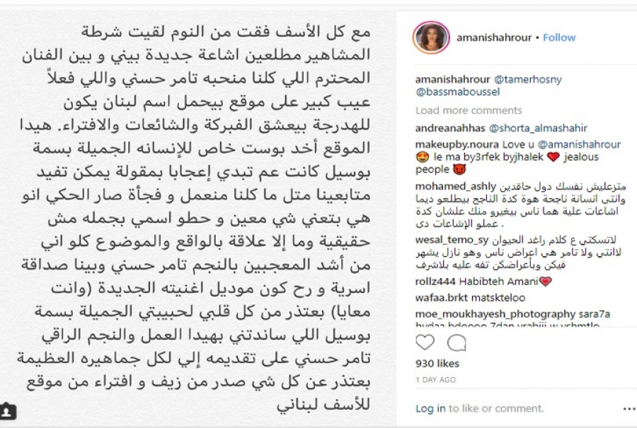 بعد انتشار خبر ارتباطها السرّي بالفنان تامر حسني، لا سيما بعد نشر زوجته بسمة بوسيل منشورًا عن الخيانة، خرجت اللبنانية أماني شحرور عن صمتها.