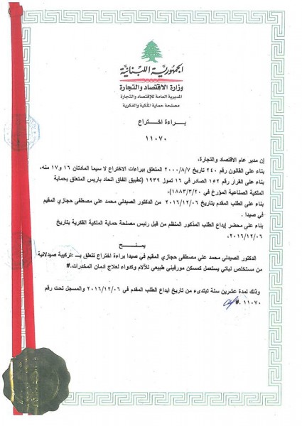 نال الدكتور الصيدلي محمد علي مصطفى حجازي براءة اختراع من وزارة الاقتصاد والتجارة، تتعلق بتركيبة صيدلانية من مستخلص نباتي يستعمل كمسكن مورفيني طبيعي للآلام وكدواء لعلاج الادمان من المخدرات وذلك لمدة عشرين عاما.
