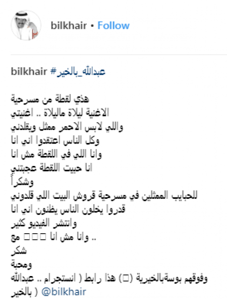نشر الفنان الإماراتي عبدالله بالخير، مقطع فيديو عبر حسابه الشخصي على إنستغرام يوضح حقيقة الحادثة التي ظهر فيها وهو يغني على المسرح وتقفز عليه فتاة منقبة، حيث كشف الفنان أن الحادثة غير حقيقية وكتب:" "الأغنية ليلاة ماليلاة. أغنيتي. واللي لابس الأحمر ممثل ويقلدني وكل الناس اعتقدوا إني أنا. وأنا اللي في اللقطة مش أنا".