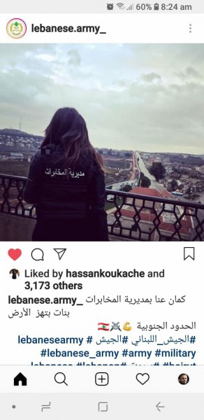 نشر حساب " الجيش اللبناني " على انستغرام صورة لجندية في مديرية المخابرات في الجيش في منطقة على الحدود الجنوبية وارفقها بتعليق " كمان عنا بمديرية المخابرات بنات بتهز الارض "