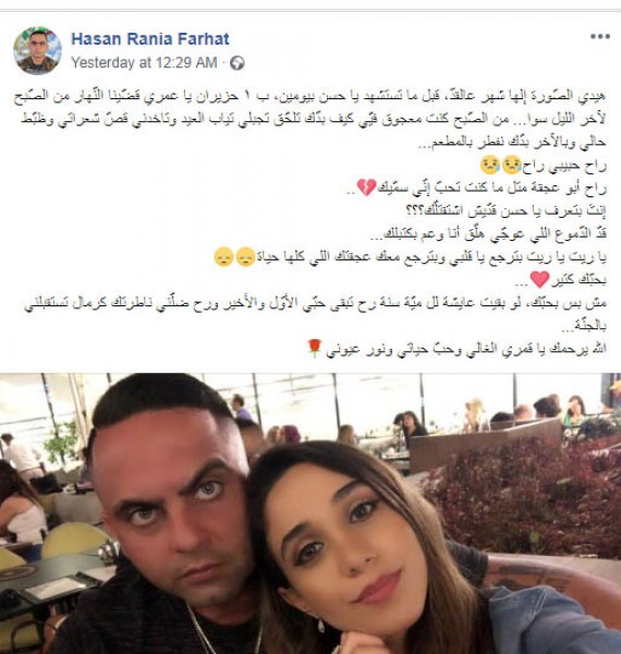 خطيبة الشهيد حسن فرحات تنشر صورة لهما قبل استشهاده بساعات: من الصّبح كنت معجوق فيّي كيف بدّك تلحّق تجبلي تياب العيد وقصّ شعراتي، اشتقتلّك قدّ الدّموع اللي عوجّي