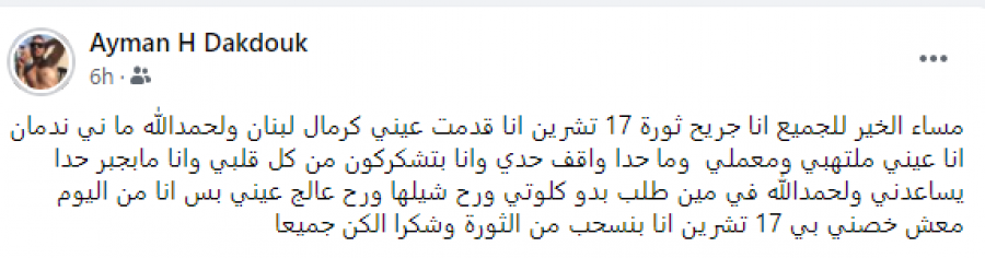 وكتب عبر صفحته على "فيسبوك": ".... أنا جريح ثورة 17 تشرين أنا قدمت عيني كرمال لبنان والحمدالله ما ني ندمان.. أنا عيني ملتهبة ومعملة.. وما حدا واقف حدي وأنا بتشكركن من كل قلبي وأنا ما بجبر حدا يساعدني والحمدالله في مين طلب بدو كليتي ورح شيلها ورح عالج عيني بس أنا من اليوم معش خصني بي 17 تشرين أنا بنسحب من الثورة وشكراً الكن جميعاً".