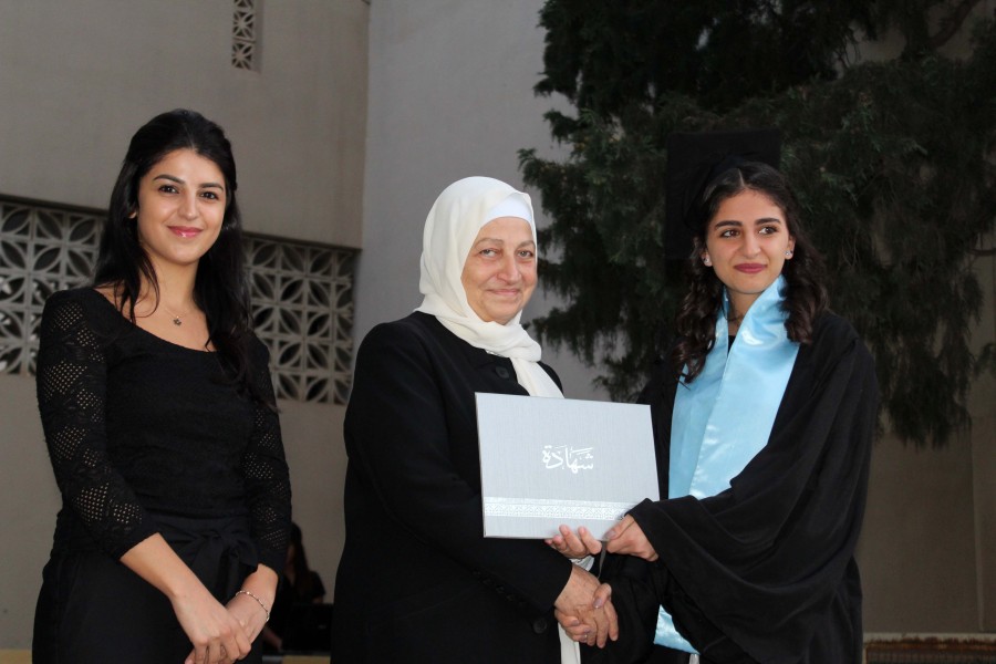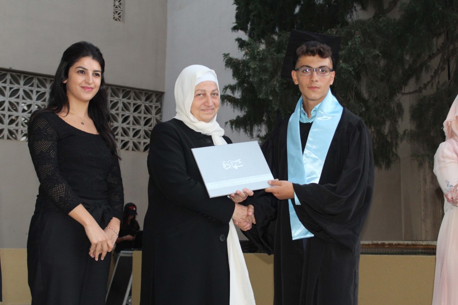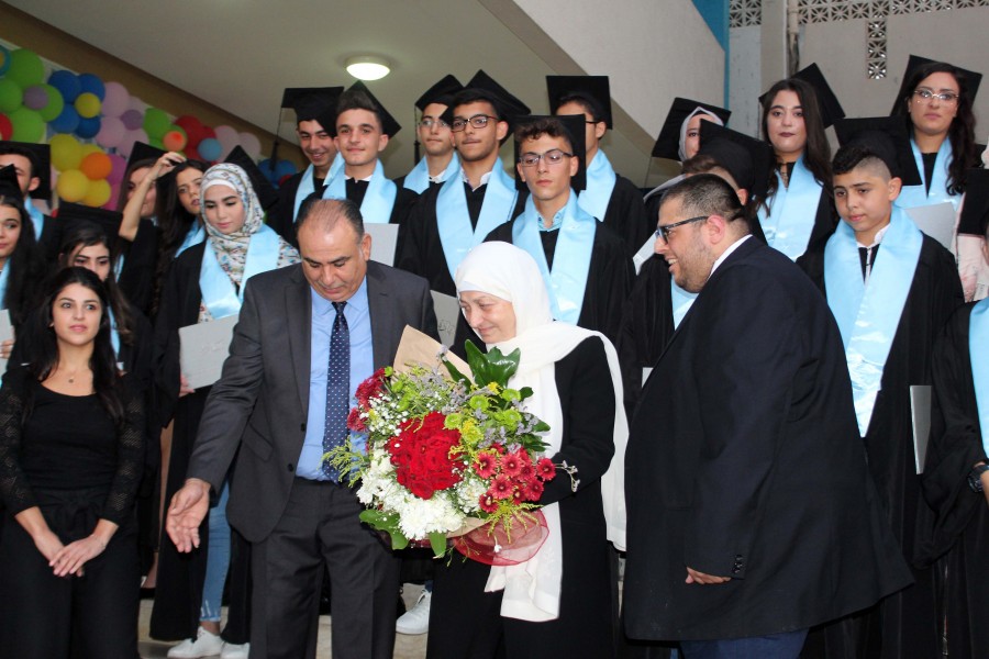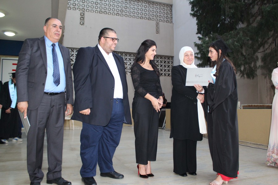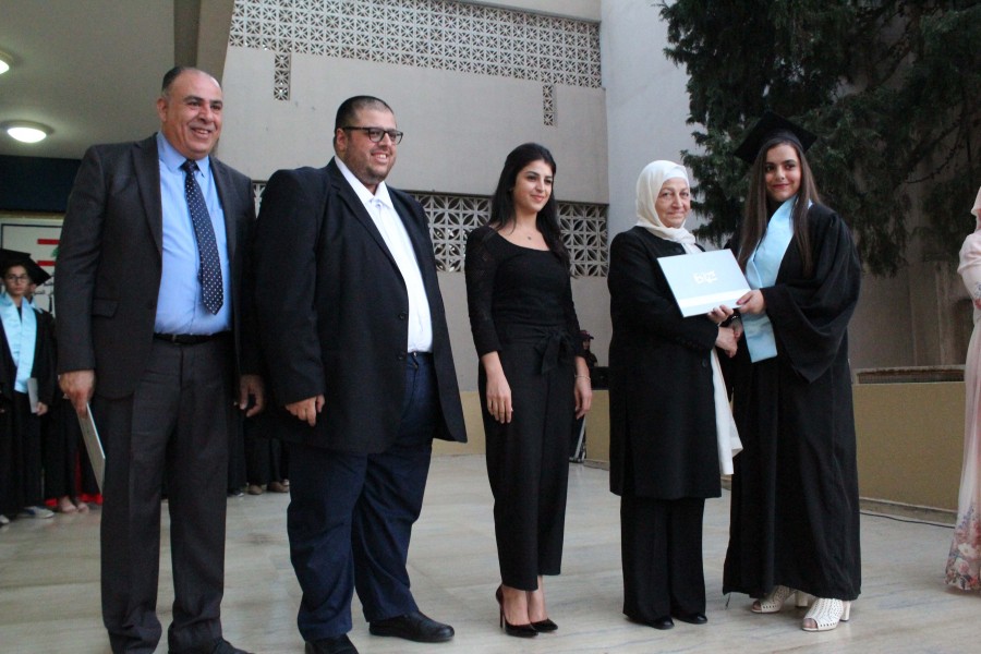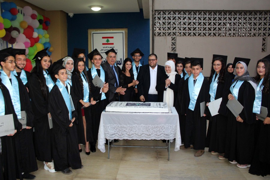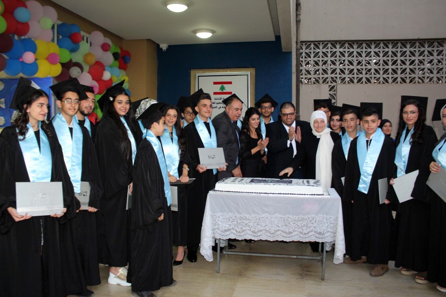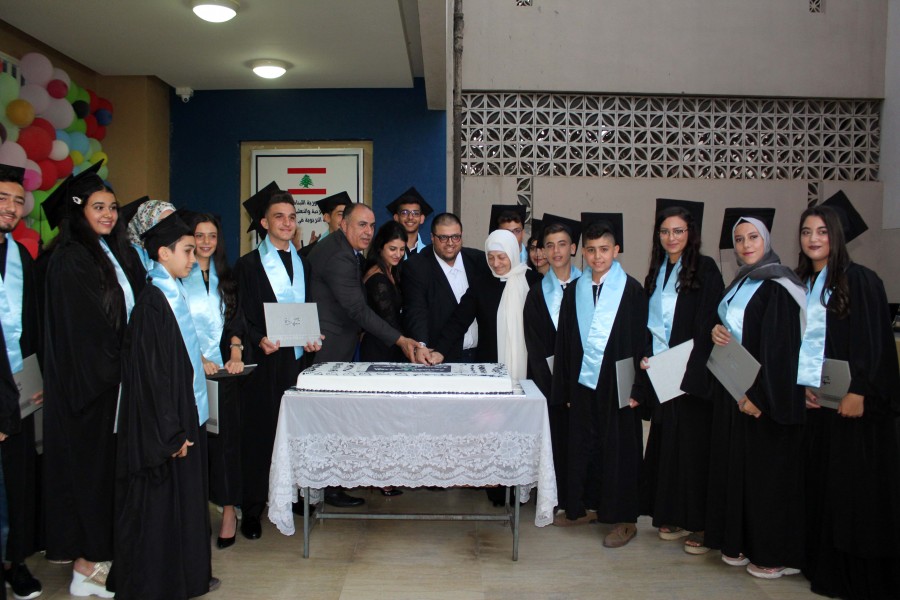 بعد ذلك قامت الحريري بمشاركة شعبان وفتوني والمدير الملاح بتوزيع الشهادات على الخريجين والخريجات . وبقطع قالب حلوى بمشاركتهم احتفاء بالمناسبة .